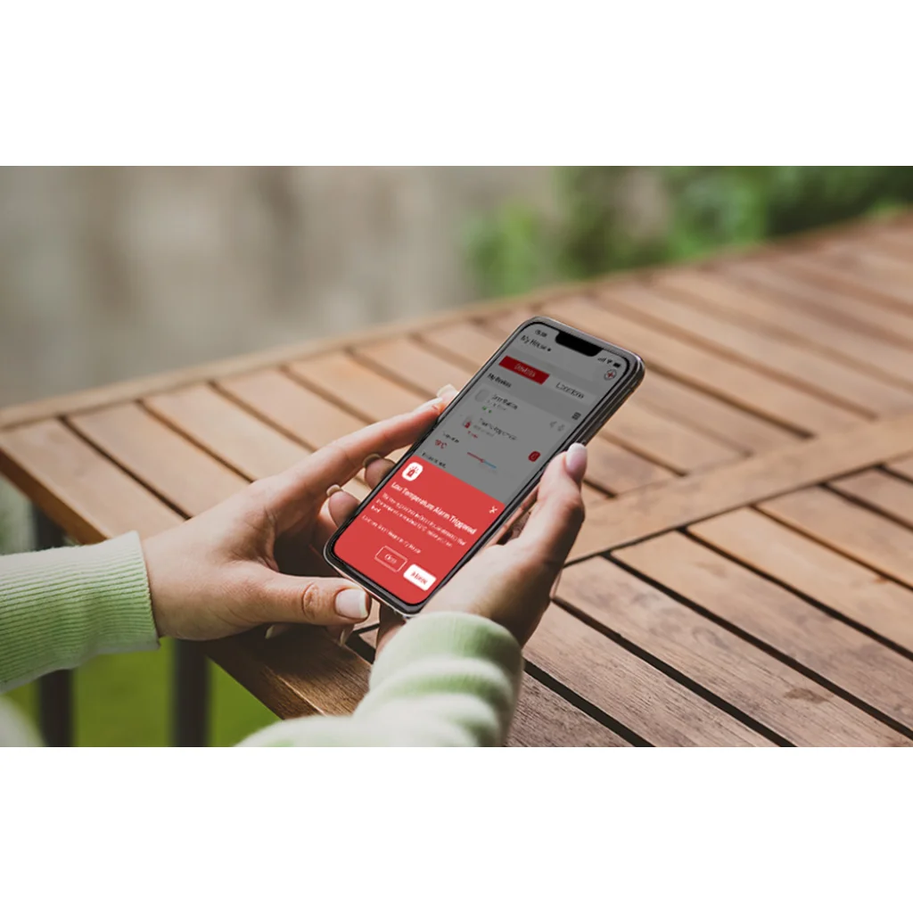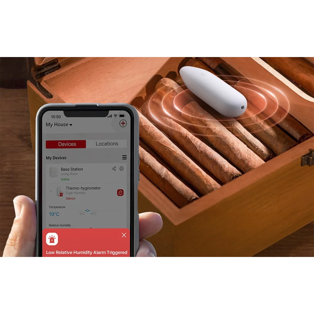 Azonnali push-értesítések: Amint a megfigyelt helyiségben a körülmények eltérnek a beállított normáktól, azonnal kap egy push értesítést a telefonjára. Ez biztosítja, hogy mindig gyorsan reagálhasson a kedvezőtlen változásokra, így elkerülheti az esetleges veszteségeket - például az értékes növények vagy a tárolt szivarok elvesztését.