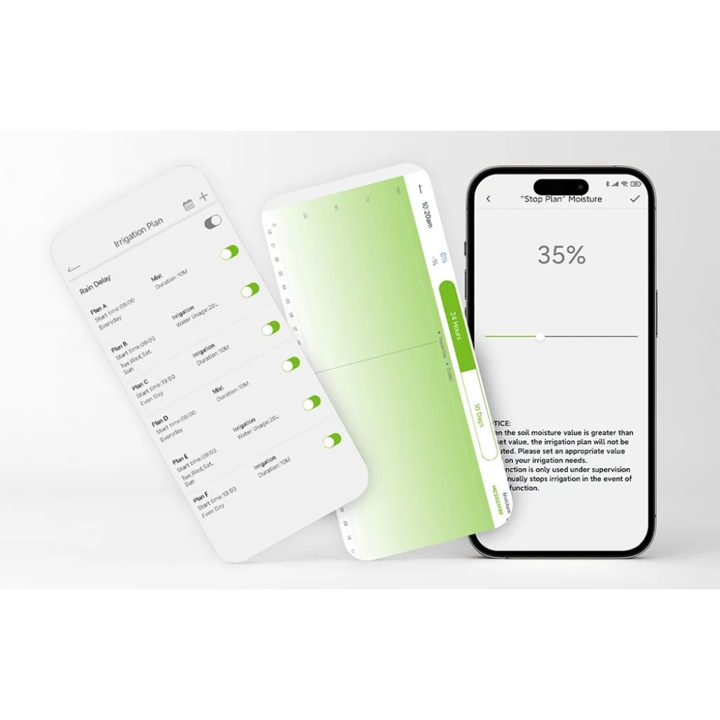 A fejlett "Stop Plan Moisture" funkció (RainPoint talajnedvesség érzékelővel együttműködve, külön kapható) megakadályozza a túlöntözést: ha a talaj nedvessége meghalad egy bizonyos szintet (például 35%), az öntözési terv automatikusan leáll, megóvva növényeit a pangó víztől. Az alkalmazás valós idejű értesítésekkel figyelmezteti a vízhiányra vagy az alacsony energiaszintre, így mindig naprakész lehet.