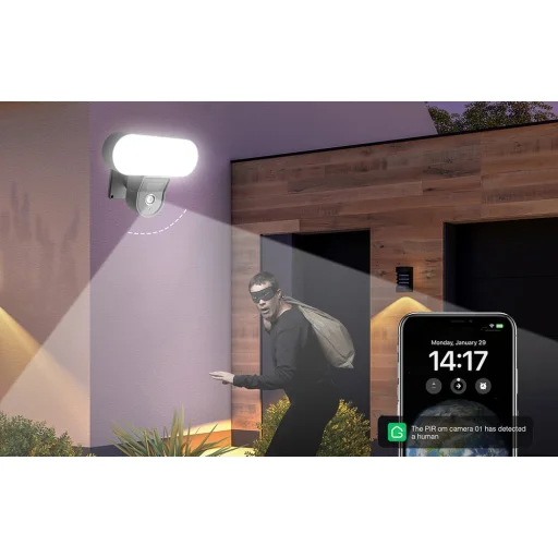 A Gosundnak köszönhetően nem kell aggódnia, hogy valaki gyanúsan közeledik otthonához, és Ön nem tud róla semmit. Az IPC3 kamera reflektorral és mozgásérzékelővel van felszerelve, amely 110°-os széles érzékelési szöggel rendelkezik. Ha valaki megjelenik az érzékelési tartományában, az eszköz automatikusan felkapcsolja a fényt, fényképet készít, majd értesítést küld az Ön telefonjára. Így lesz ideje reagálni!