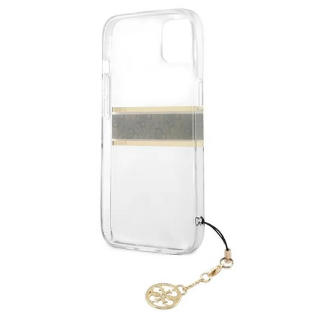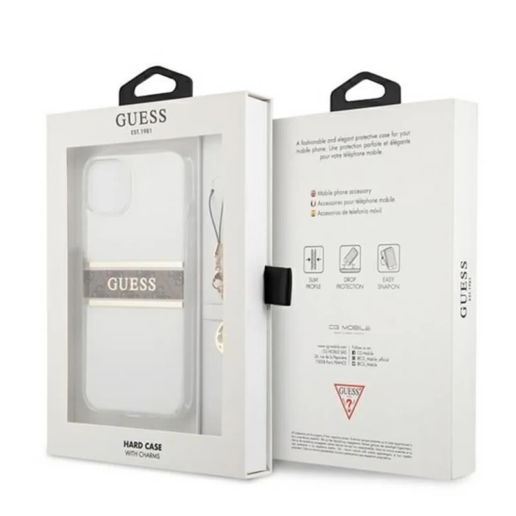 A Guess 4G Stripe Charm egy TPU -ból készült átlátszó tok. Középen egy arany csík található, amely barna színű sáfránybőrre és 4G emblémára van nyomtatva, és amelyen egy nagy Guess logó látható. Egy vonzó medál, és az arany színű Guess logó rendkívüli eleganciát kölcsönöz a toknak.