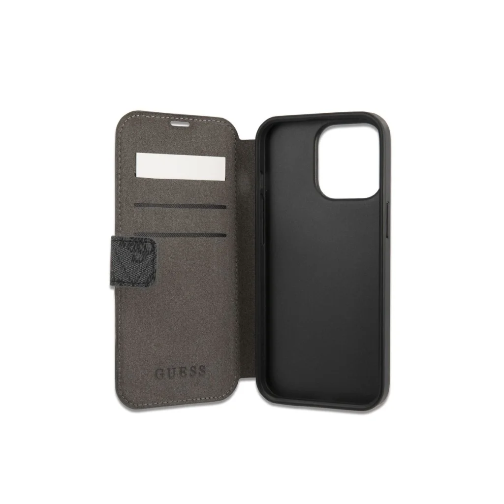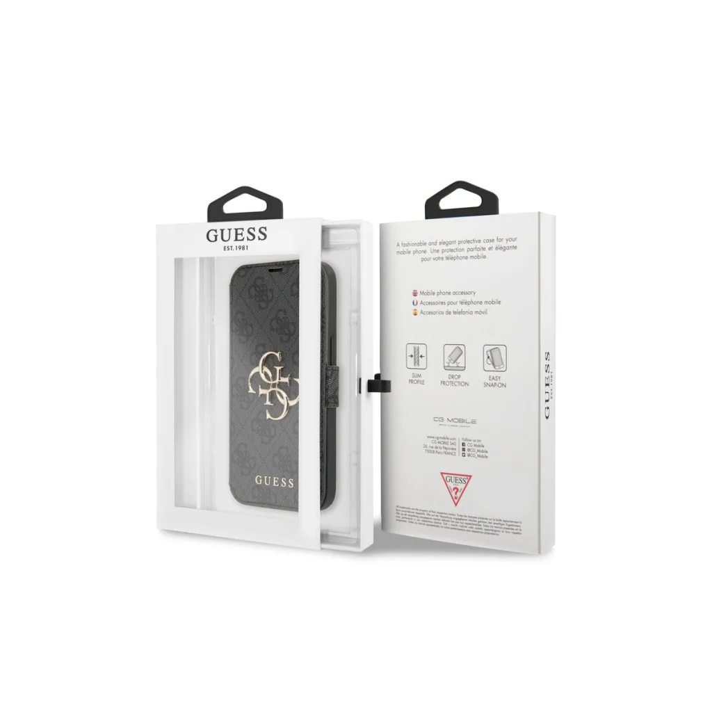 A Guess márkanév évtizedek óta kitűnő formatervezésű és legmagasabb minőséget képvisel. Nyomtatott 4G logóval rendelkezik a fényűző Saffiano textúrán. A tok védi az egész eszközt, hozzáférést biztosítva minden porthoz és gombhoz, és két belső kártyatartóval rendelkezik.