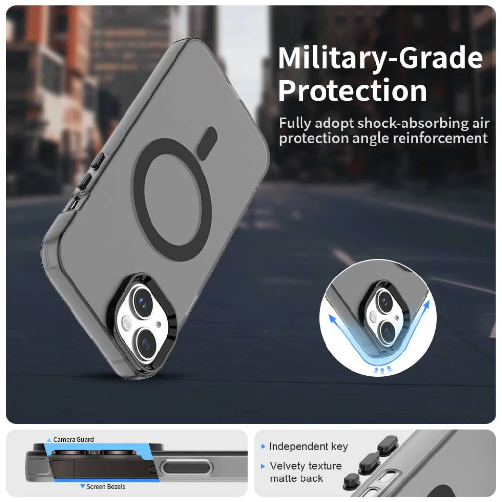 - Ütésálló védelem: A tok kialakítása úgynevezett "légpárnás" technológiát alkalmaz a sarkokon, amely hatékonyan nyeli el az ütéseket és a leejtésekből származó energiát, jelentősen csökkentve a telefon sérülésének kockázatát. Ez a fokozott sarokvédelem biztosítja a katonai szintű esésállóságot.