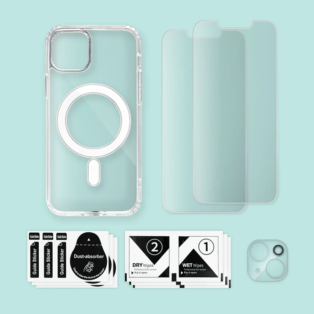 Minőségi HD 2.5D 0.33mm 9H kijelzővédő üvegfólia (2db), plusz kamera lencse védő üvegfólia(1db), áttetsző MagSafe kompatibilis TPU tokkal. Megvédi telefonja kijelzőjét a karcoktól, kisebb külső behatásoktól. Zsír-olajtaszító felülete ujjlenyomat mentes használatot biztosít. A csomagban megtalálható a felhelyezéshez szükséges nedves-száraz törlő, illetve a poreltávolító matrica is. Pontos kialakításának és minőségi anyaghasználatnak köszönhetően nem sötétít kijelzőjén, az érzékelést pedig nem akadályozza. A 9H kamera lencse védő biztosítja a kép tisztaságát, nem befolyásolja a készített fényképen minőségét(nem csillan bele a ''vaku'').