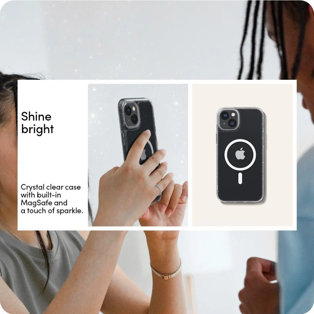 - Stílus és funkcionalitás: Megőrzi iPhone 14 Plus készüléked eleganciáját, miközben modern MagSafe funkcióval és egyedi csillogó megjelenéssel dobja fel.