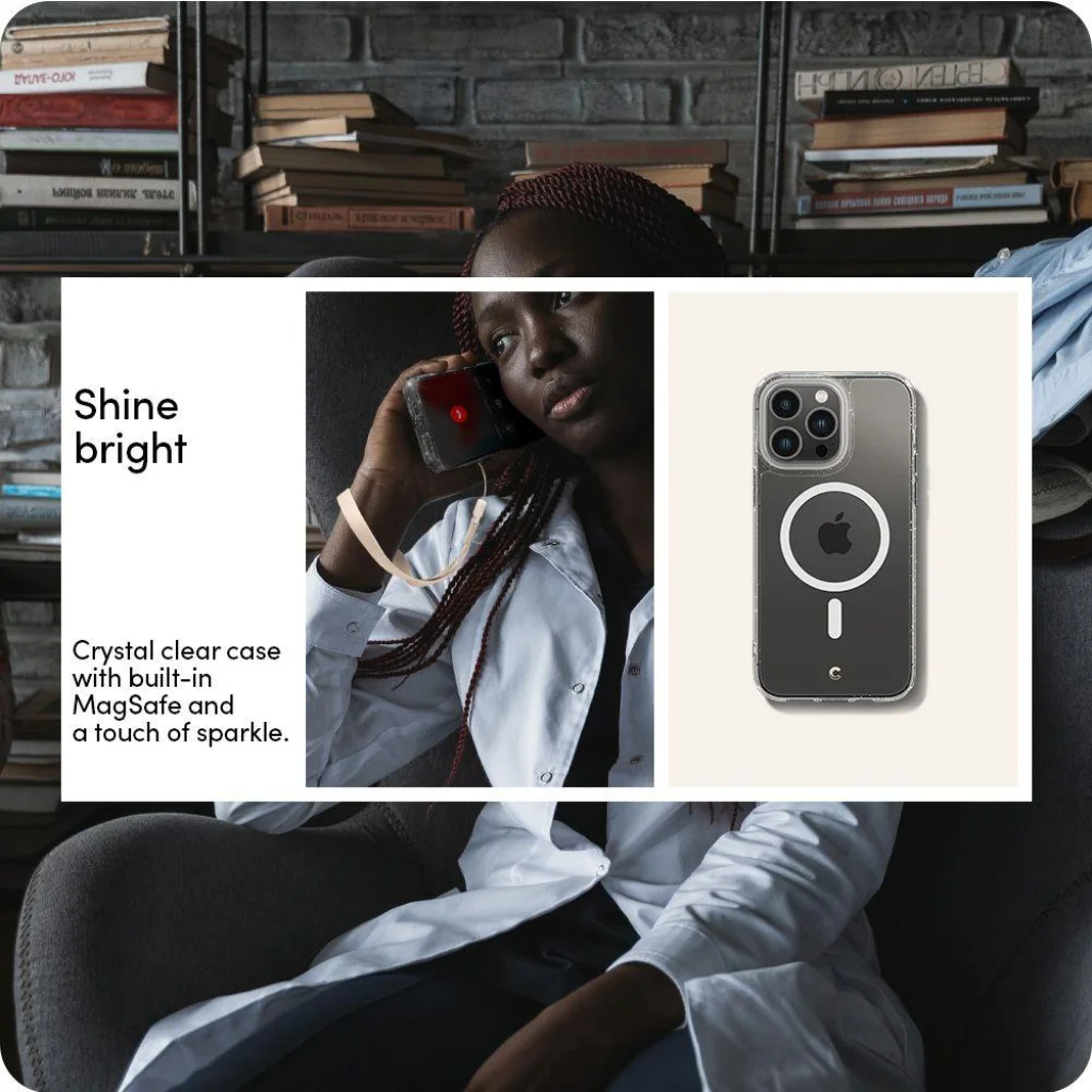 A tokba beépített mágnesgyűrűnek köszönhetően a Spigen Cyrill Shine tok teljes mértékben MagSafe-kompatibilis. Ez azt jelenti, hogy könnyedén és gyorsan rögzítheted MagSafe töltődet vagy más MagSafe kiegészítődet a tok eltávolítása nélkül, így a vezeték nélküli töltés sosem volt még ilyen egyszerű és hatékony. Tartsd a tokot a telefonodon MagSafe töltés közben is!