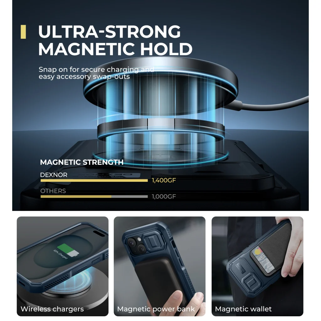 Tapasztalja meg a Dexnor tok kivételes mágneses erejét, amely akár 1400g (1400GF) tartóerőt is biztosít, sok más tok 1000GF erejével szemben. Ez a robusztus MagSafe kompatibilitás garantálja, hogy telefonja biztonságosan csatlakozik minden MagSafe tartozékhoz, legyen szó vezeték nélküli töltőkről, mágneses power bankokról vagy MagSafe pénztárcákról. Biztos lehet benne, hogy telefonja a helyén marad és biztonságban van, bármilyen helyzetben is használja.