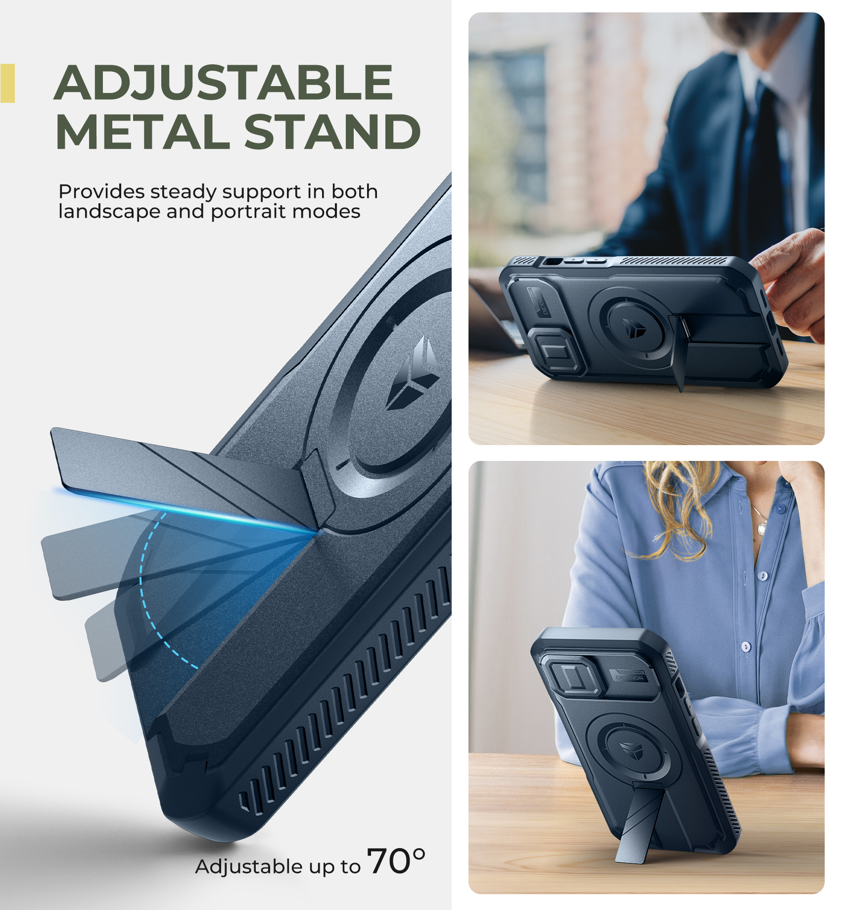 A kiváló minőségű alumíniumötvözetből készült állítható állvány rendkívül strapabíró és hosszú élettartamú. Lehetővé teszi telefonja stabil rögzítését mind fekvő (tájkép), mind álló (portré) módban, akár 70 fokig állítható dőlésszöggel. Ez kiváló stabilitást és kényelmet biztosít a kéz nélküli filmnézéshez, videóhívásokhoz vagy böngészéshez, bárhol is legyen.
