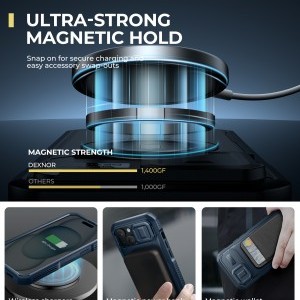 Tapasztalja meg a Dexnor tok kivételes mágneses erejét, amely akár 1400g (1400GF) tartóerőt is biztosít, sok más tok 1000GF erejével szemben. Ez a robusztus MagSafe kompatibilitás garantálja, hogy telefonja biztonságosan csatlakozik minden MagSafe tartozékhoz, legyen szó vezeték nélküli töltőkről, mágneses power bankokról vagy MagSafe pénztárcákról. Biztos lehet benne, hogy telefonja a helyén marad és biztonságban van, bármilyen helyzetben is használja.