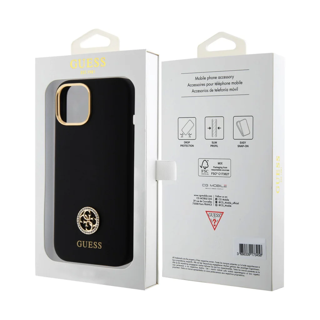 A 4G fém logó a Guess felirattal a borító hátulján ragyog, kiemelve annak exkluzivitását és eredetiségét.