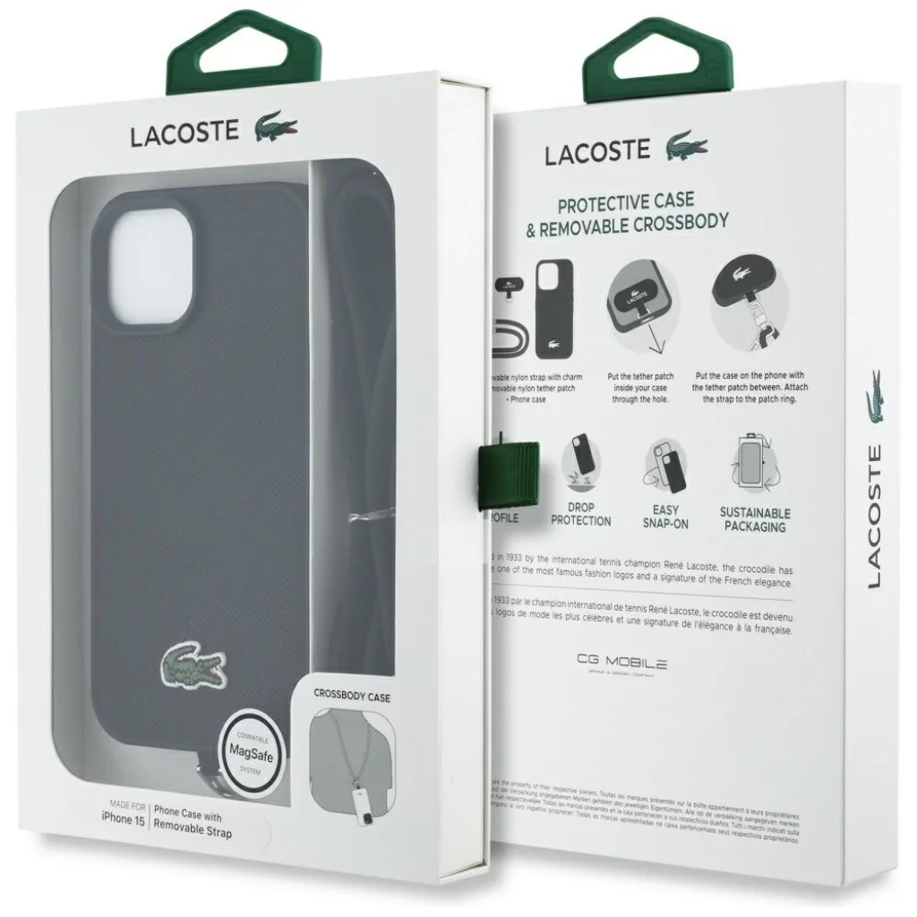 A Lacoste egy elismert francia márka, amely tökéletesen ötvözi az elegáns stílust a sportos kényelemmel. A legújabb védőtoke kollekció egyedi stílusával és hihetetlen funkcióival kápráztat el, de legfőképpen garantálja a készülékének megbízható védelmét. A tok érdekes textúrával rendelkezik, amely nemcsak szemet gyönyörködtető, hanem kellemes tapintási élményt is nyújt. A tok felületének finom kidolgozása esztétikus és funkcionális, biztonságos fogást és kényelmes használatot kínál. A gyűjteményt az ikonikus krokodil képe díszíti, amely tökéletesen tükrözi a Lacoste márka szellemét, ötvözve az eleganciát a sportos stílussal. Az Iconic Petit Pique Crossbody Cord MagSafe kollekció tokjai kizárólag a legmagasabb minőségű anyagokból készülnek. A tok héja erős polikarbonátból készült, melyet kellemes tapintású poliuretán borít, izgalmas textúrával - a polikarbonát véd a karcolások és ütések ellen, míg a poliuretán biztosítja a készülék biztonságos fogását. A tok rugalmas oldala lehetővé teszi a könnyű és gyors felszerelést. A tok mágneses gyűrűvel van felszerelve, amely kompatibilis a MagSafe vezeték nélküli töltővel, biztosítva a gyors és egyszerű töltést. A beépített mágnesek tökéletesen illeszkednek a felhasználó telefonjához, és erős kapcsolatot biztosítanak a MagSafe töltővel. A készlet egy kényelmes nyakpántot tartalmaz, amely nemcsak praktikus kiegészítő, hanem kiemeli az egyedi stílusát is. A tok a Lacoste márka engedélyével készült. Technikai adatok: Kollekció: Iconic Petit Pique Crossbody Cord MagSafe, Típus: Hardcase, Anyag: TPU / PC, Szín: Fekete, Kompatibilitás: iPhone 15 6.1".