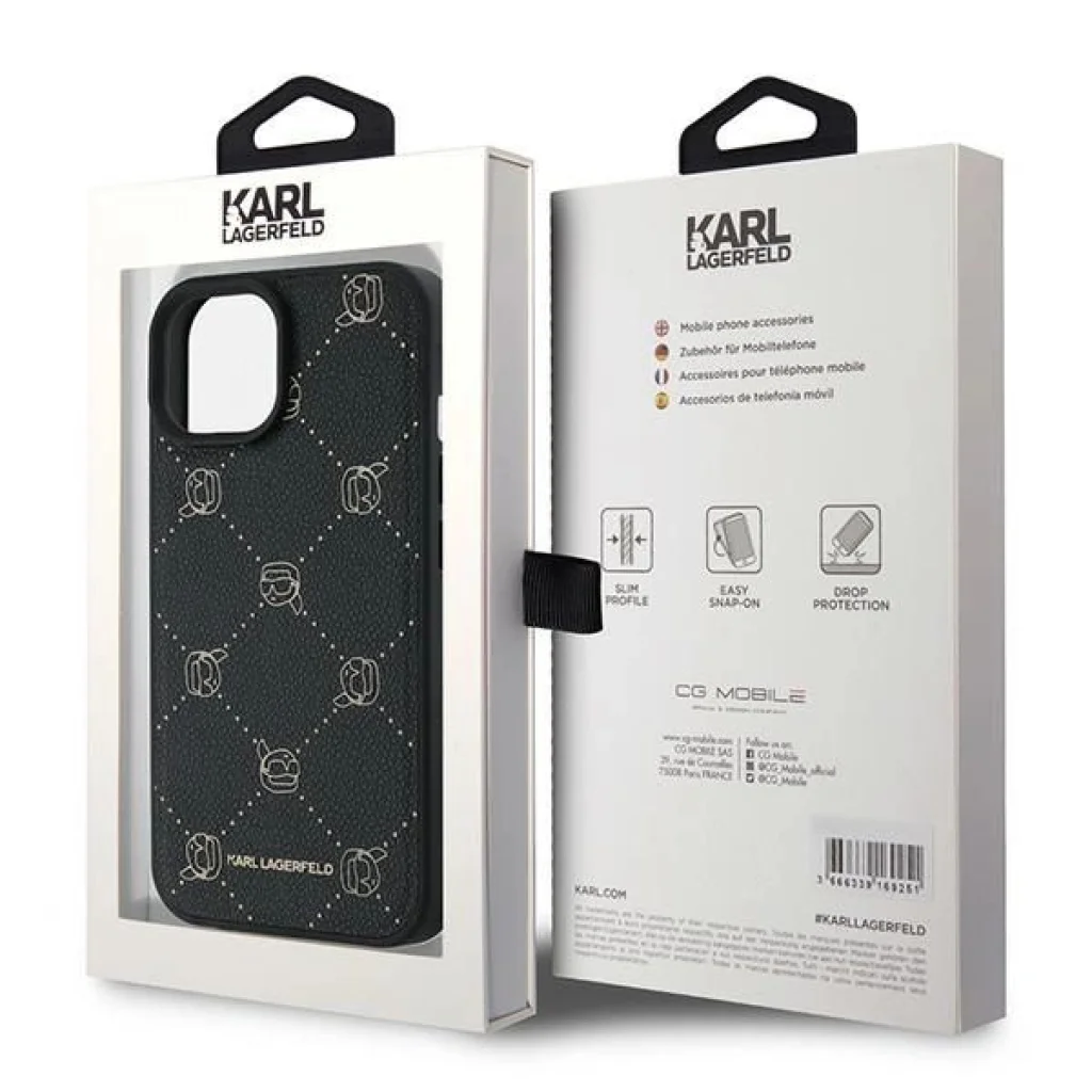 Emeld ki kifinomultságod! Ez az elegáns tok biztosan felkelti a figyelmet egyedi formatervezésével. A fő motívum Karl Lagerfeld fejének finom körvonalai, melyek egyenletes, geometriai mintában helyezkednek el, elegáns és modern jelleget adva az összképnek. A tok öko bőrből készült, és az alsó részén a híres divatház logója díszíti.