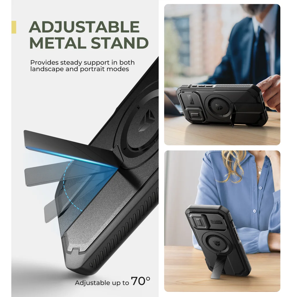 A prémium minőségű alumíniumötvözetből készült, állítható állvány rendkívül masszív és tartós. Biztosan tartja telefonját mind fekvő, mind álló módban, akár 70 fokos szögben is. Ez a funkció kiváló stabilitást és kényelmet biztosít a kéz nélküli filmnézéshez, videóhívásokhoz vagy böngészéshez, így bárhol élvezheti a médiafogyasztást.