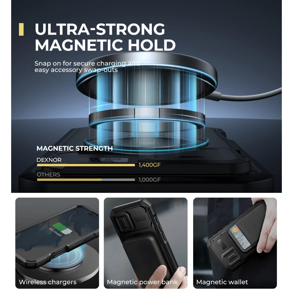 Tapasztalja meg a MagSafe erejét a Dexnor tokkal! Az akár 1400g mágneses tartóerővel (szemben más tokok 1000g-os értékével) ez a robusztus tok biztonságosan rögzíti telefonját az összes MagSafe tartozékhoz. Legyen szó vezeték nélküli töltőről, autós tartóról, mágneses power bankról vagy pénztárcáról, telefonja stabilan és biztonságosan a helyén marad bármilyen helyzetben.