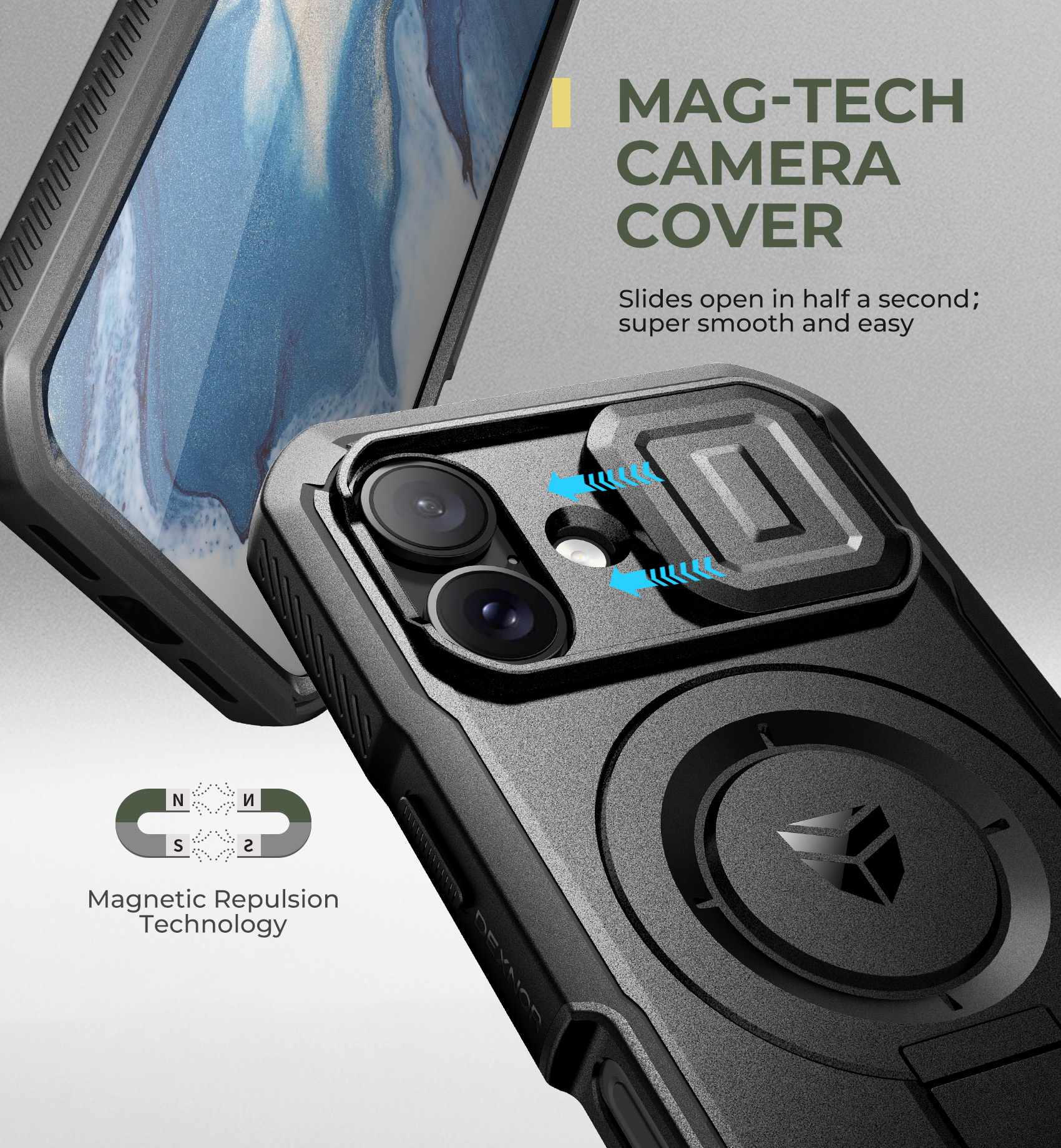 Védje meg iPhone 16 kameráját egy innovatív, csúsztatható fedéllel! A "MAG-TECH CAMERA COVER" technológia fél másodperc alatt, rendkívül simán és könnyedén nyitható és zárható. A mágneses taszító technológia (Magnetic Repulsion Technology) biztosítja a megbízható működést, így lencséi mindig biztonságban lesznek a karcolásoktól és szennyeződésektől.