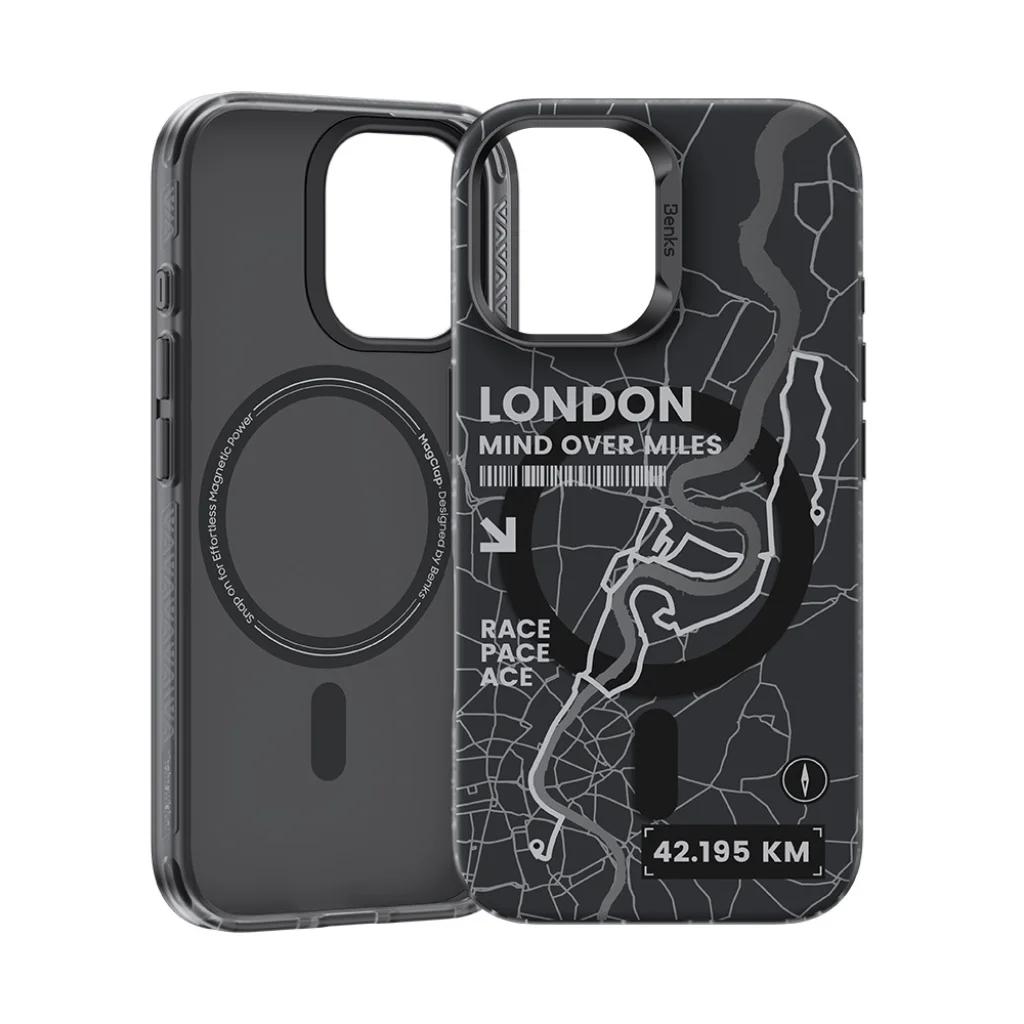 Lépjen be London ikonikus utcáira és érezze a maraton inspiráló szellemét a Benks Magnetic City London tokkal, amelyet kifejezetten az iPhone 16 Plus-hoz terveztek. Ez a tok több, mint egyszerű védelem; egy vizuális élmény, amely a brit főváros pulzáló energiáját viszi a tenyerébe. A részletes, fekete-szürke városi térkép mintázat – amely a város szívét és a maraton útvonalát ábrázolja – olyan motiváló üzenetekkel egészül ki, mint a "MIND OVER MILES", "RACE PACE ACE" és a klasszikus "42.195 KM" maraton távolság. A Benks gondosan kidolgozott designja egyedülálló módon ötvözi az urbanista esztétikát az állóképesség, a felfedezés és az egyéni teljesítmény üzenetével. Tökéletes választás azoknak, akik rajonganak a városért, a sportért, vagy egyszerűen csak egy igazán különleges kiegészítőre vágynak, amely stílusosan kiemeli őket a tömegből.