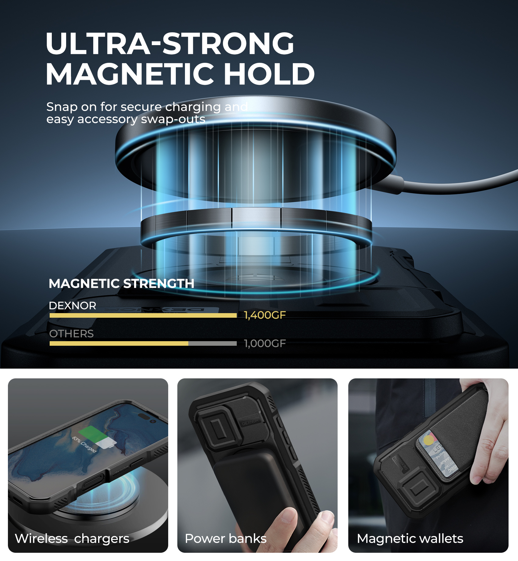Élvezze a páratlan MagSafe erőt akár 1400g mágneses tartással, amely messze felülmúlja a legtöbb hagyományos MagSafe tokot. Ez a robusztus tok stabilan tartja telefonját az összes MagSafe tartozékon – legyen szó vezeték nélküli töltőkről, külső akkumulátorokról vagy mágneses pénztárcákról. Biztosítja, hogy telefonja a helyén maradjon és biztonságban legyen minden helyzetben, miközben egyszerűvé teszi a tartozékok cseréjét.