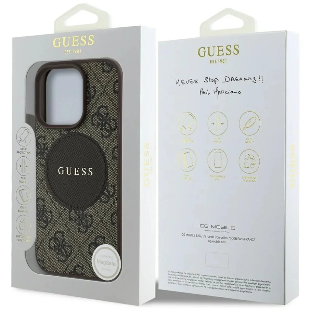 A Guess 4G Circle Classic Logo MagSafe tok egy exkluzív védőtok-sorozat, amely ötvözi a kivételes funkcionalitást és a stílusos, egyedi designt. Ezt a kollekciót azok számára tervezték, akik értékelik nemcsak a telefonjuk biztonságát, hanem az elegáns külsőt is. A Guess márka exkluzív védőtokja az elegancia és stílus legmagasabb szintjét képviseli. A tok magas minőségű ökobőrrel van bevonva, amelynek felületét a jellegzetes 4G minta díszíti. A tok belsejében található Guess logó finoman hangsúlyozza a tok presztízsét. Ez a funkcionalitás és az elegáns design tökéletes kombinációja, amely nemcsak jól védi a telefont, hanem divatos kiegészítővé is teszi. Szilárd felépítés és tökéletes illeszkedés Jól megválasztott méreteinek köszönhetően a tok hatékonyan tompítja az eséseket, miközben teljes hozzáférést biztosít a portokhoz és gombokhoz. A tok oldalai kellően rugalmasak a könnyű felhelyezéshez és levételhez, de mindenekelőtt tökéletesen védik a készülék keretét az ütődésektől vagy esetleges sérülésektől. Finoman emelt külső szélei megvédik a telefon kijelzőjét a sérülésektől. Töltse telefonját vezeték nélkül! A tok mágneses gyűrűvel van felszerelve, amely kompatibilis a MagSafe vezeték nélküli töltővel, biztosítva a gyors és könnyű töltést. A tokba beépített mágnesek tökéletesen illeszkednek a felhasználó telefonjához, és biztosítják a készülék erős tapadását a MagSafe töltőhöz. A tok a Guess márka engedélyével készült. Műszaki adatok Gyűjtemény: Guess 4G Circle Classic Logo MagSafe Típus: Keménytok Anyag: TPU / PC / Ökobőr Szín: Barna Kompatibilitás: iPhone 16 Pro Max 6.9"