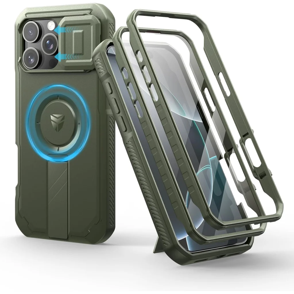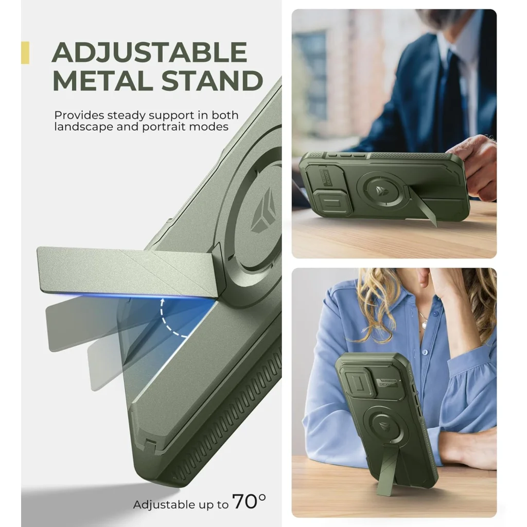 A Dexnor ütésálló MagSafe tok az iPhone 16 Pro Max számára készült, hogy készülékedet a legkeményebb körülmények között is megóvja. Ez a zöld színű, robusztus tok nem csak kiváló védelmet nyújt, hanem beépített, állítható fém állványával és ultra-erős MagSafe kompatibilitásával a funkcionalitást is új szintre emeli.