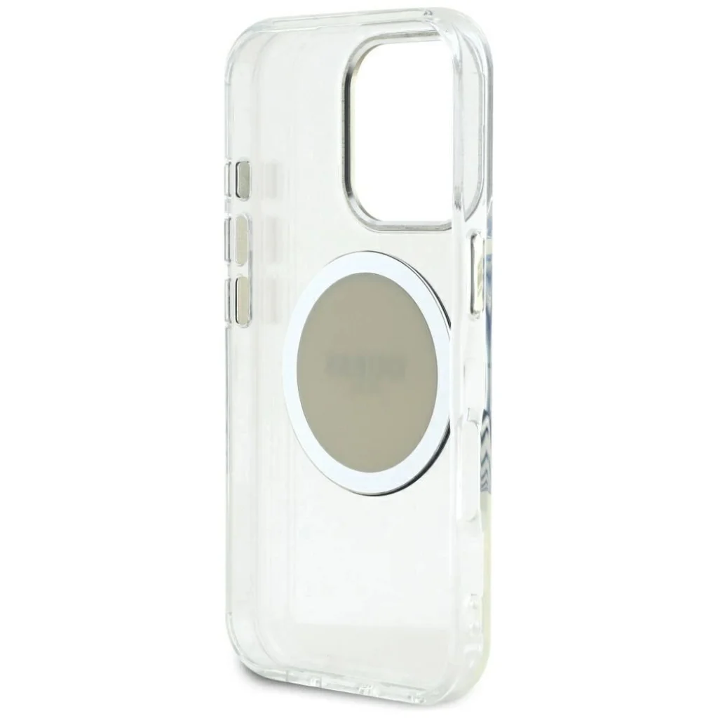 Töltse telefonját vezeték nélkül! A tok egy mágnesgyűrűvel van felszerelve, amely kompatibilis a MagSafe vezeték nélküli töltővel, biztosítva a gyors és egyszerű töltést. A tokba épített mágnesek tökéletesen illeszkednek a felhasználó telefonjához, és biztosítják az eszköz erős tapadását a MagSafe töltőhöz. A tok a Guess márka engedélyével készült.