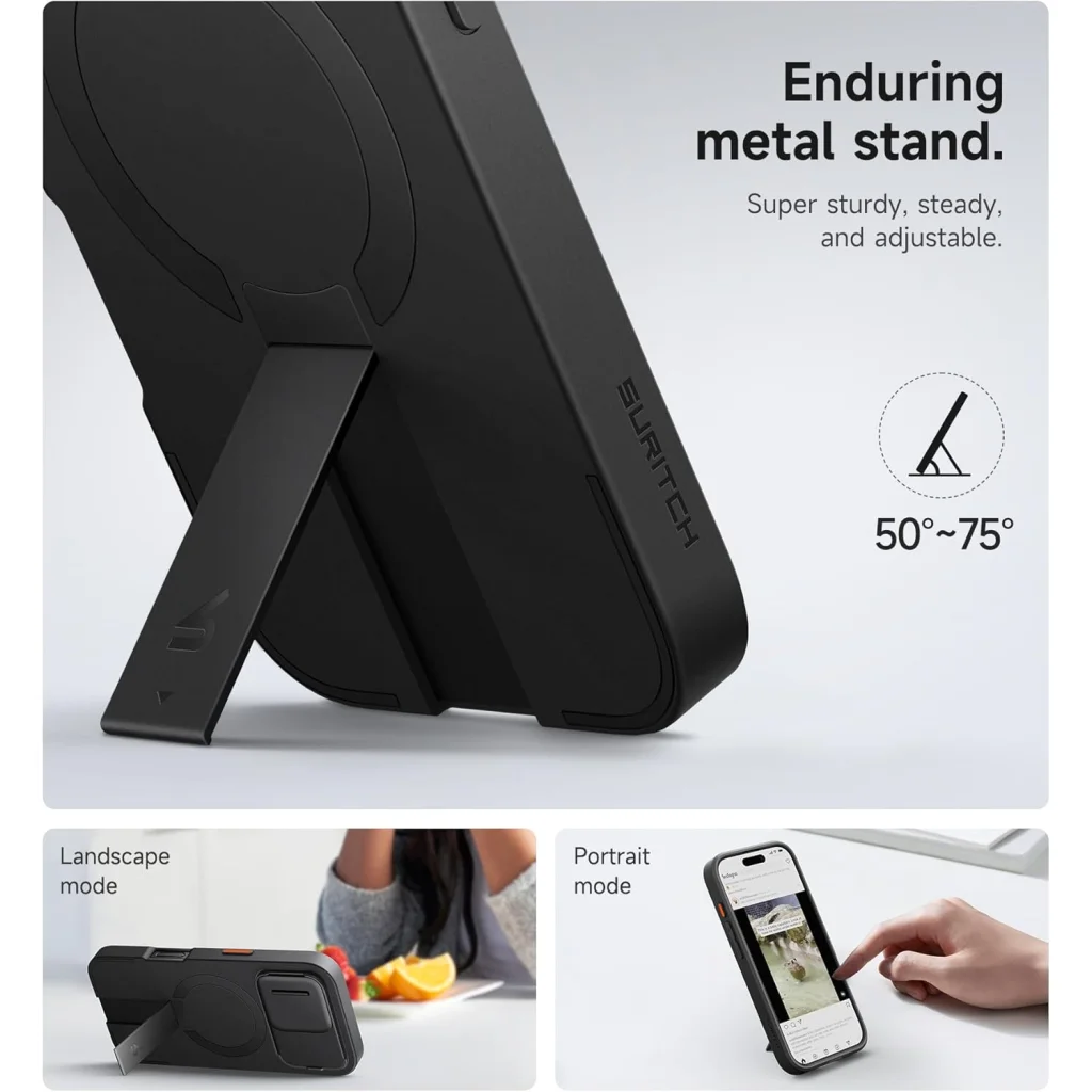 Élvezze a kényelmes médiafogyasztást vagy videóhívásokat a beépített, strapabíró fém állvánnyal. Ez a szuper stabil és állítható mechanizmus 50° és 75° közötti szögben rögzíthető, és tökéletes mind fekvő (landscape), mind álló (portrait) módban történő használatra. Olvasson, nézzen videókat, vagy dolgozzon a telefonján a legkényelmesebb szögben, kezei szabadon maradnak.