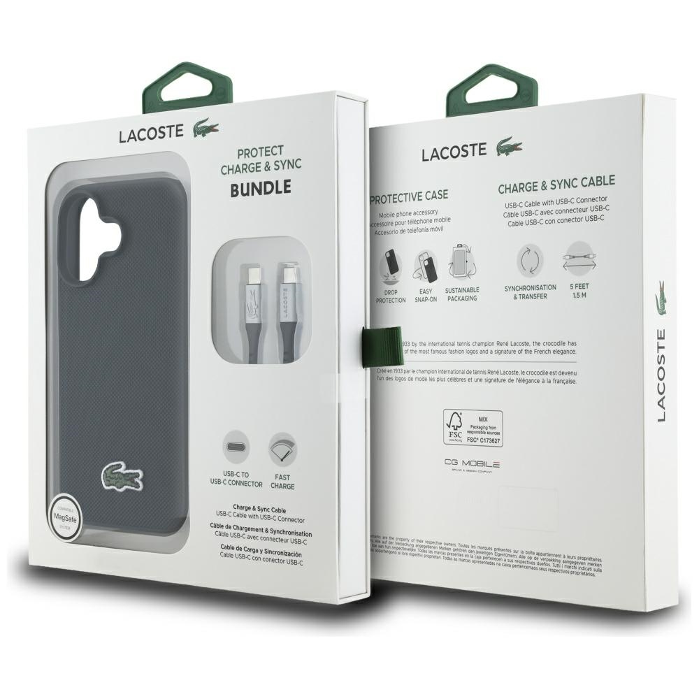 A szett tartalmaz egy USB-C/USB-C 1,5 m kábelt is, amely kényelmes töltést és kapcsolatot biztosít más eszközökkel. A tok a Lacoste márka engedélye alapján készül.