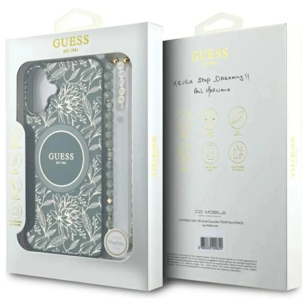 Adj stílust és eleganciát! Ez az elegáns kollekció még a legigényesebb és legkifinomultabb ízlést is elbűvöli. A tok felső rétege finom, aranyszínű, növényi mintával díszített, amely elegáns és klasszikus megjelenést kölcsönöz neki. A tok központi eleme az arany MagSafe gyűrű, amely stílusos Guess logóval körülvéve növeli a presztízst és kiemeli a különleges dizájnt. Az egészet egy ízléses gyöngyskarkötő egészíti ki, amely harmonizál a tok színvilágával, és az apró gyöngyök a "GUESS" nevet formálják, így az eszköz nemcsak praktikus, hanem rendkívül divatos is.