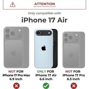 Fontos: Kérjük, vásárlás előtt ellenőrizze telefonmodelljét! Ez a tok kizárólag az iPhone 17 Air (6.6 hüvelyk) modellhez készült. Nem kompatibilis az iPhone 17 Pro Max (6.9 hüvelyk) vagy az iPhone 17 Pro (6.3 hüvelyk) modellekkel.