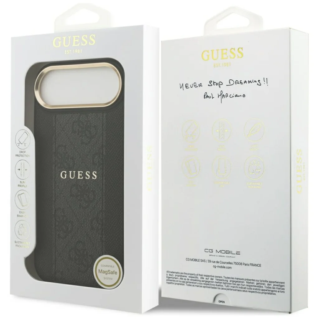 A Guess 4G Stripe MagSafe tok egy exkluzív védőtok sorozat, amely kiváló funkcionalitást és egyedi, stílusos megjelenést egyesít. Ezt a kollekciót azok számára hozták létre, akik fontosnak tartják telefonjuk biztonságát és az elegáns megjelenést. Ez a tökéletes választás minden MagSafe technológiájú készülék tulajdonosa számára. Az exkluzív védőtok a híres Guess márkától a legmagasabb szinten ötvözi az eleganciát és a stílust. A tok felszíne elegáns öko-bőrrel van borítva, amelyet középső csík díszít a jellegzetes 4G mintával. A kamera kerete és gombok arany színben készültek, hangsúlyozva a kiegészítő luxus jellegét. A tok közepén egy diszkrét Guess logó található, amely teljessé teszi az elegáns dizájnt. A tok gyártása a Guess márkájú licenc alatt történt.