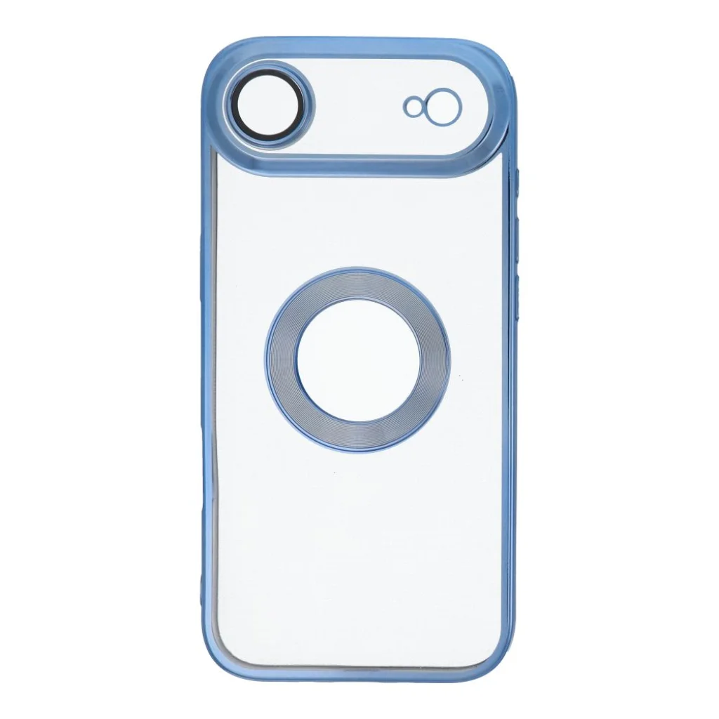 - Páratlan kialakítás: Ideális választás azok számára, akik szeretik a szokatlan és figyelemfelkeltő megoldásokat. A tok hátlapja átlátszó, így engedi érvényesülni az iPhone eredeti szépségét, míg a kék, csillogó keret és a dekoratív, MagSafe-et idéző gyűrű egyedi karaktert kölcsönöz a telefonodnak. A gyűrű finoman textúrázott felülete tovább növeli az esztétikai élményt.