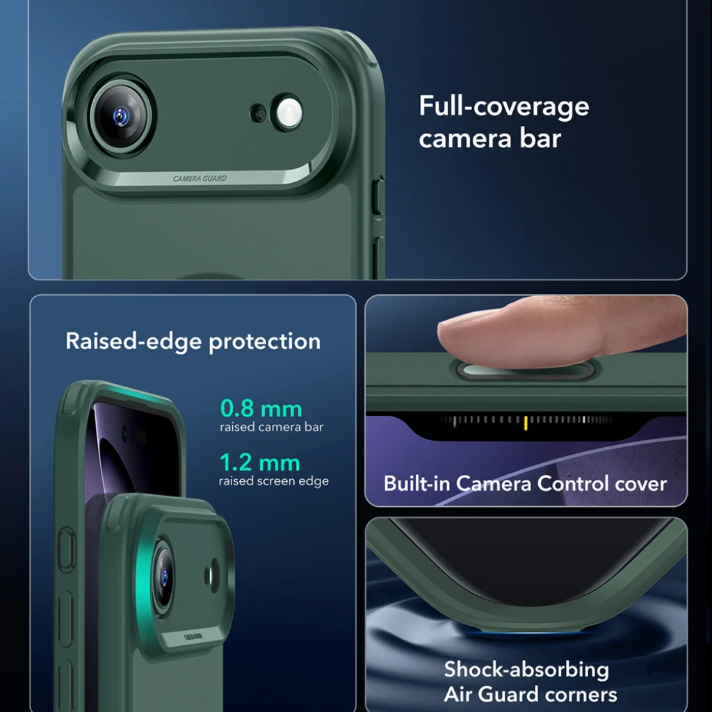 Az ESR tokjának egyik legkiemelkedőbb tulajdonsága a beépített, teljes lefedettségű kameravédő sáv, amely egyedi vezérlési lehetőségeket kínál.