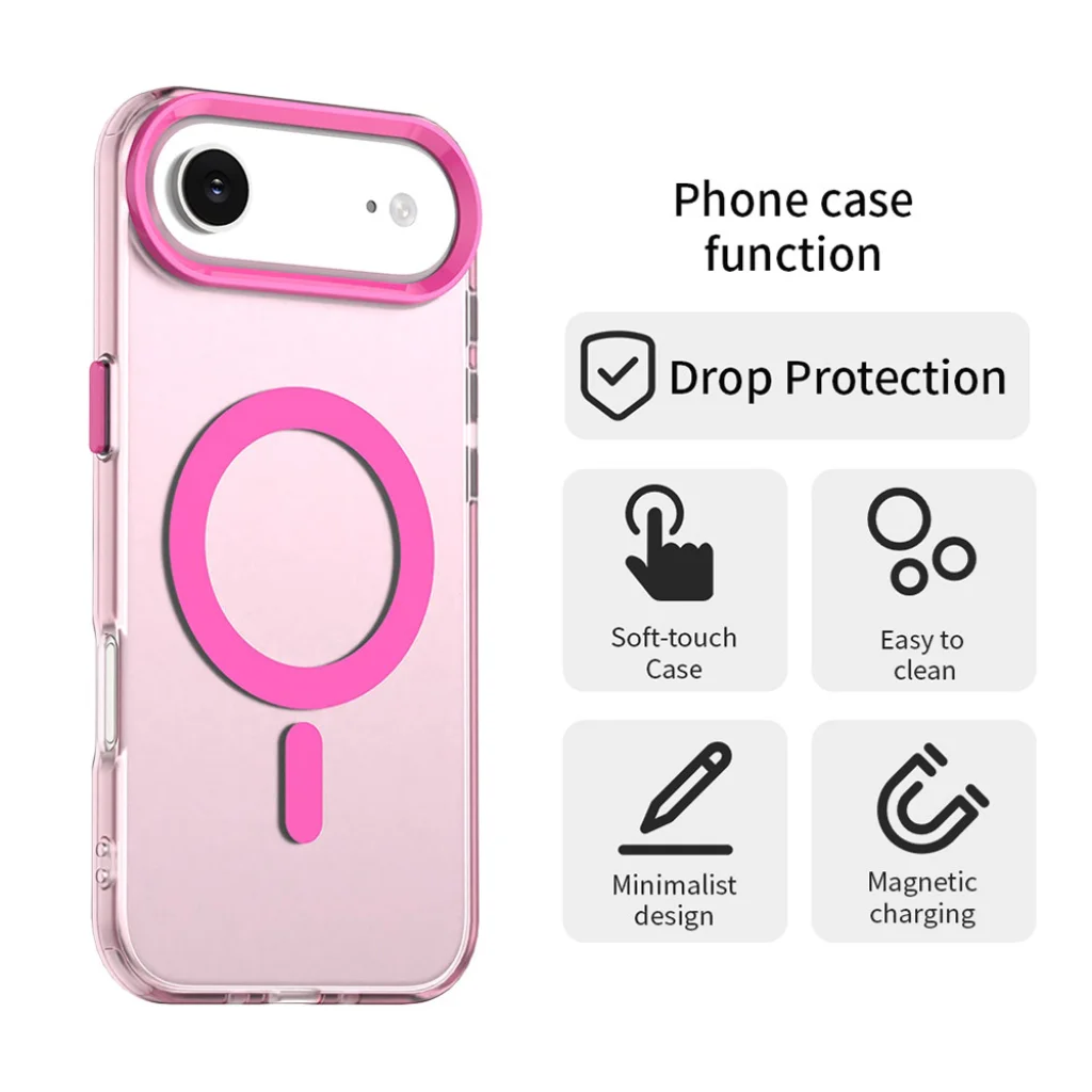 A CandyCase MagSafe tok elegáns, átlátszó kialakítása élénk rózsaszín kerettel és MagSafe gyűrűvel tökéletesen illeszkedik az iPhone 17 Air letisztult formavilágához. A precíz kivágások és a pontos gombborítások biztosítják a zökkenőmentes hozzáférést az összes funkcióhoz.