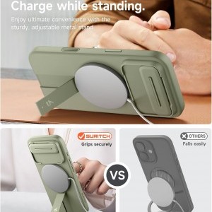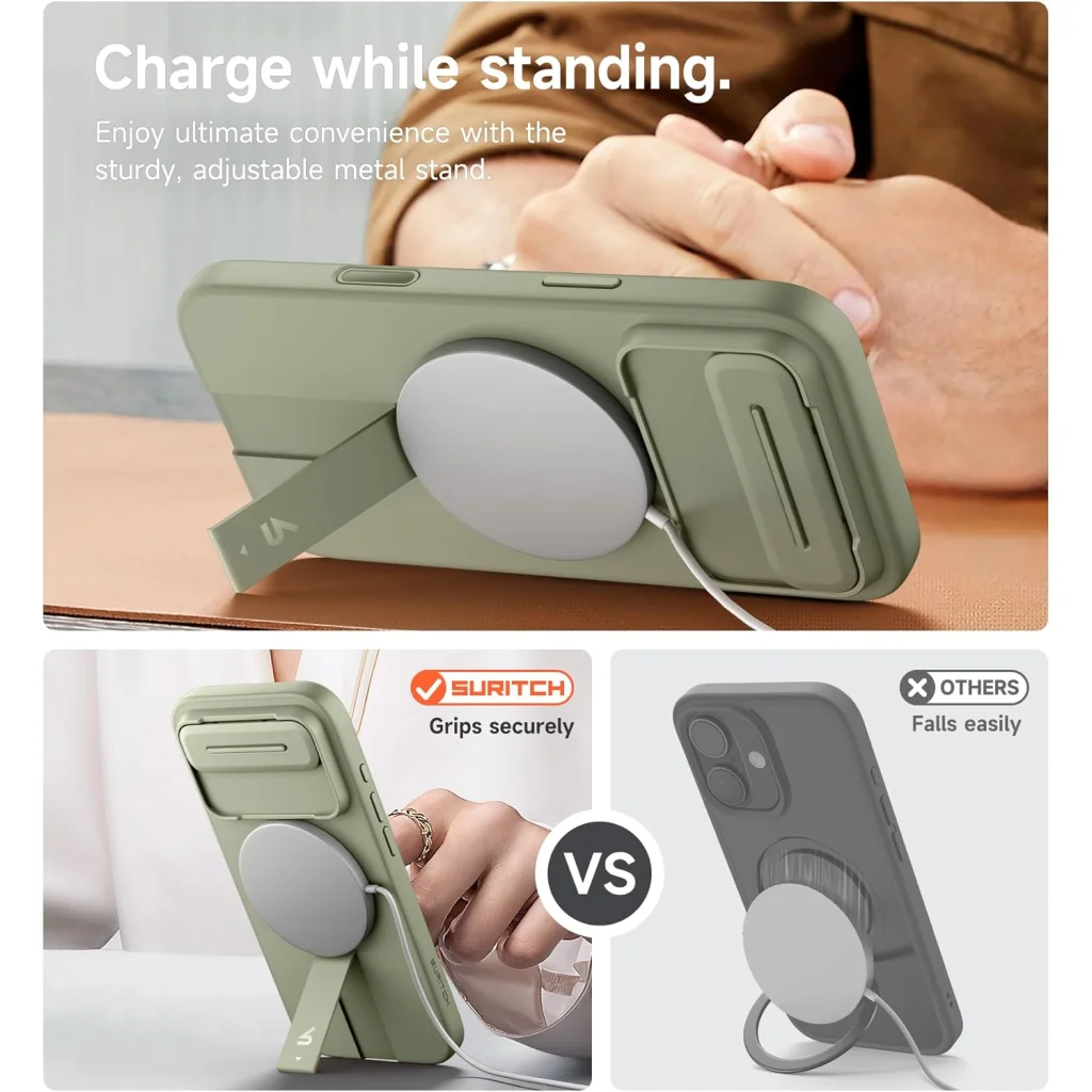 Élvezze a páratlan kényelmet a masszív, állítható fém állvánnyal. Akár videókat nézne, online megbeszélésen venne részt, vagy akár töltés közben szeretné használni a telefont, az állvány biztosítja a stabil és ideális betekintési szöget. Más tokokkal ellentétben a Suritch állványa biztosan tartja a telefont, így nem kell aggódnia, hogy az könnyen felborul, és lehetővé teszi a kényelmes töltést is álló helyzetben.