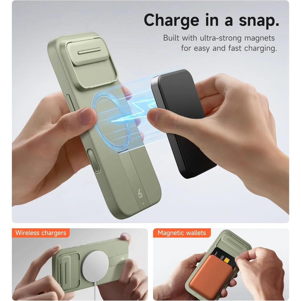 A tok ultra-erős mágnesekkel van beépítve, biztosítva a problémamentes MagSafe kompatibilitást. Töltsd telefonodat pillanatok alatt, könnyedén és gyorsan, anélkül, hogy a tokot el kellene távolítani. A tok biztonságosan illeszkedik vezeték nélküli töltőkhöz és mágneses pénztárcákhoz, valamint minden egyéb MagSafe kiegészítőhöz. A "Snap and Go" funkció lehetővé teszi, hogy egyszerűen és stabilan rögzítse készülékét mágneses autós tartókon vagy más kiegészítőkön, és ugyanolyan könnyedén le is vegye anélkül, hogy a tartó elengedné a telefont.