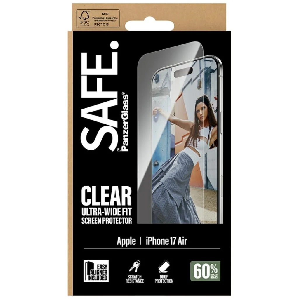 SAFE edzett üveg. A PanzerGlass által kifejlesztett Ultra-Wide Fit EasyAligner Megbízható képernyővédelem. A SAFE. by PanzerGlass® Ultra-Wide Fit képernyővédő az iPhone 17 számára kiváló védelmet nyújt repedések, karcolások és mindennapi balesetek ellen. 60%-ban újrahasznosított üvegből készült, diszkrét légzsákként funkcionál, elnyeli az ütközéseket és minden helyzetben megóvja a telefont. Az oleofób bevonat hatékonyan csökkenti az ujjlenyomatokat, zsírt és szennyeződéseket, így a képernyő mindig tiszta és átlátható marad. Napi kényelem és funkcionalitás A rendkívül széles illeszkedésű kialakításnak köszönhetően a védőfólia a telefon teljes elülső felületét lefedi, biztosítva a teljes átláthatóságot és a kristálytiszta képernyőnézetet. Emellett kis margót hagy a széleken, lehetővé téve a védőtokokkal való zökkenőmentes kompatibilitást. A 100%-os érintésérzékenység azt jelenti, hogy a képernyő pontosan úgy működik, mint az eredeti – késedelem vagy válaszkészség csökkenése nélkül. Ez a megoldás maximális védelmet és felhasználói kényelmet egyesít. Könnyű telepítés és környezetbarát választás Az EasyAligner eszköz, a lépésről-lépésre útmutatás és az online telepítési videó segítségével a telepítés rendkívül egyszerű. A termék FSC™-tanúsítvánnyal ellátott papírcsomagolásban érkezik, és a 33%-os papírfelhasználás csökkenése a márka környezetvédelmi elkötelezettségét mutatja. A Globális Újrahasznosított Szabvány (GRS) követelményeinek megfelelően átláthatóságot biztosít a gyártási folyamatban és tényleges támogatást nyújt a körkörös gazdaság érdekében. Tudatos választás, amely meghosszabbítja telefonja élettartamát és elősegíti a fenntarthatóbb jövőt. Műszaki specifikációk Márka: PanzerGlass Készüléktípus: Telefon Modell: Apple iPhone Air Mit tartalmaz a csomag? SAFE edzett üveg PanzerGlass Ultra-Wide Fit EasyAligner iPhone számára.