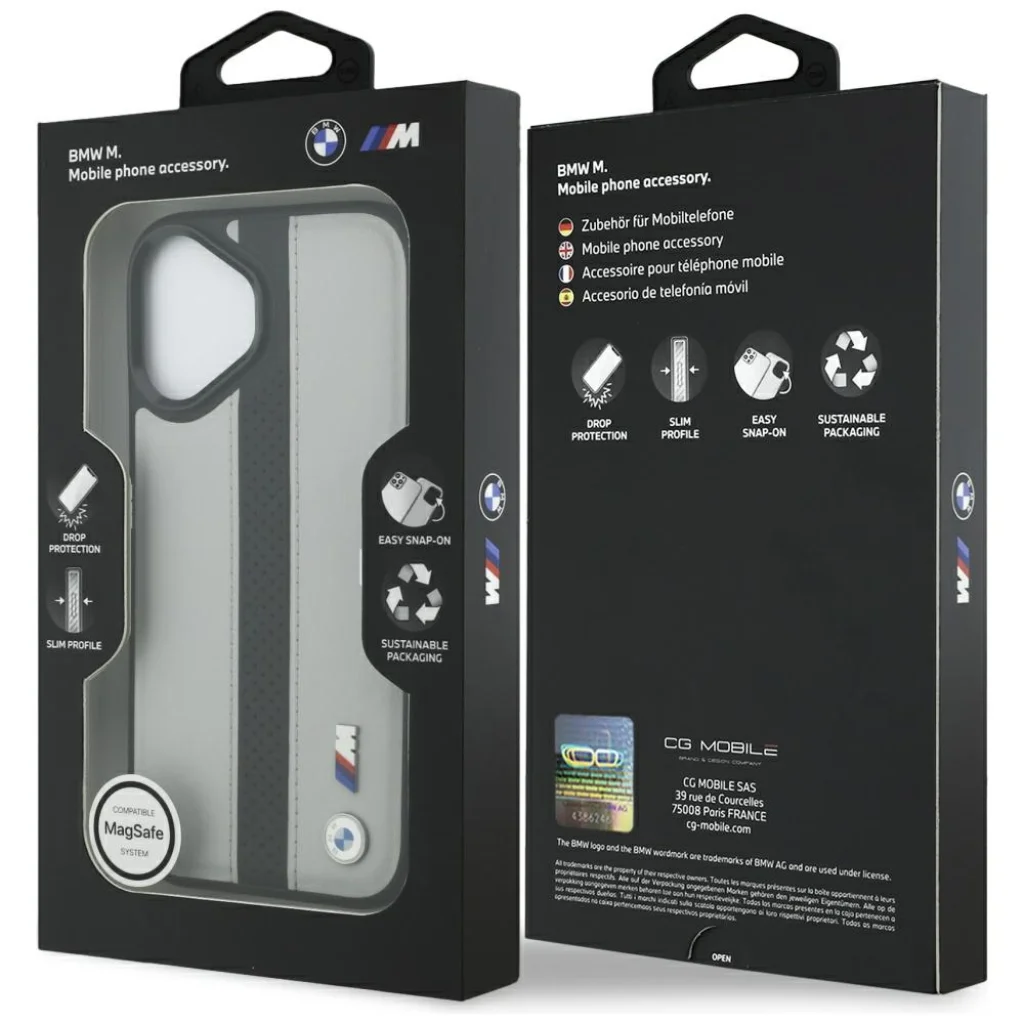 Exkluzív BMW tok az M Perforált Csíkozású Logós MagSafe kollekcióból, amely egy prémium minőségű fedél, a világ egyik legismertebb autómárkája által támogatva. Ideális választás minden MagSafe technológiával rendelkező eszköz tulajdonosának. Az exkluzív védőtok az elismert BMW márkától az elegancia és az egyedi stílus kombinációja. A tok kiváló minőségű öko-bőrből készült, amelyen egy függőleges perforált csík található, biztosítva a tartósságot és az autóipar által inspirált jellegzetes megjelenést. A hátoldalon BMW fém logó és M logó található, amely kihangsúlyozza a kollekció hitelességét. A fekete kamerakeret és gombok kiegészítik az egészet, növelve a tartósságot és elegáns jelleget adnak a toknak. Tökéletes kombinációját nyújtja a funkcionalitásnak és a divatos dizájnnak, amely megvédi a telefonodat és egyedi kiegészítővé is válik. A tok rugalmas szélekkel van ellátva, lehetővé téve a gyors felhelyezést és eltávolítást. Karcsú kialakítása nem növeli jelentősen a telefon méreteit, miközben védelmet nyújt az esések ellen. A kissé megemelt élek a képernyő és a kamera körül további védelmet adnak a karcolások ellen. Minden precíz kivágással és gombfedéllel rendelkezik, biztosítva a telefon teljes kényelmű használatát. A tok mágneses gyűrűvel van felszerelve, amely kompatibilis a MagSafe vezeték nélküli töltővel, biztosítva a gyors és egyszerű töltést. A beépített mágnesek tökéletesen illeszkednek a telefonhoz, biztosítva az iPhone erős tapadását a MagSafe töltőhöz. A tok BMW márka licenc alapján készült.