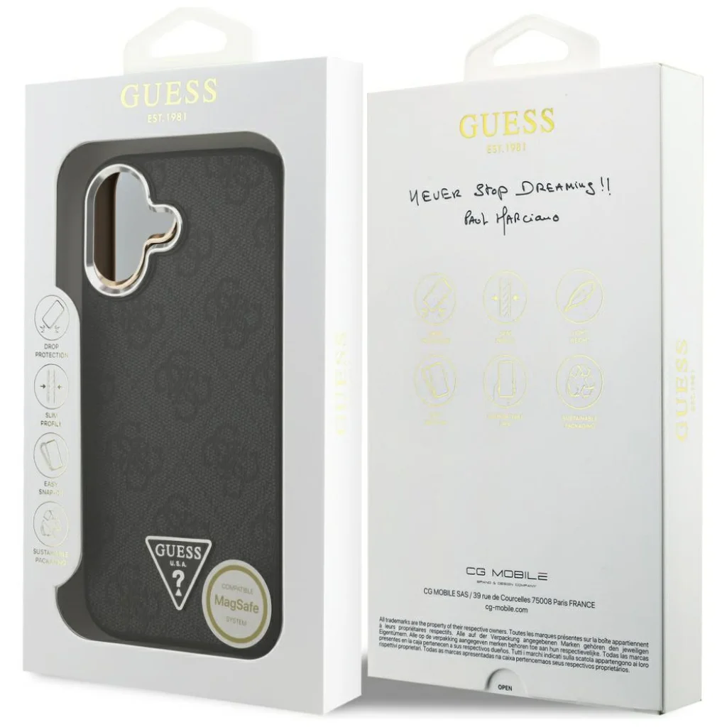 Válaszd az iPhone 17 Fekete Guess - Hardcase 4G Triangle Logo MagSafe tokot, ha egy prémium minőségű, stílusos és funkcionalitásban gazdag védelmet szeretnél készüléked számára. A Guess eleganciája, a megbízható védelem és a MagSafe kényelme tökéletes kombinációt alkotnak a modern felhasználó számára.