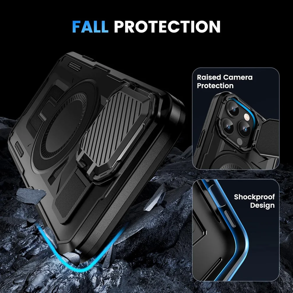 A "CamVault" elnevezés a tok leginnovatívabb funkciójára utal: a 2 az 1-ben fém kamerafedél és kitámasztó. Ez a precízen kialakított, fémből készült, megemelt kameravédelmi rész óvja az iPhone 17 precíziós optikáját a sérülésektől és karcolásoktól, anélkül, hogy akadályozná a fényképezést. A fedél ráadásul több mint 3000-szeres nyitás-zárás ciklusra van tesztelve, és mint egy sokoldalú kitámasztó, 0° és 135° között állítható. Ezen felül, a tokba épített "Super Magnetic Ring Design" rendkívül erős mágneses vonzást biztosít, amely tökéletes illeszkedést garantál a MagSafe töltőkhöz és egyéb MagSafe kiegészítőkhöz, mint például autós tartókhoz vagy külső akkumulátorokhoz, garantálva a gyors és stabil vezeték nélküli töltést az "Ultra Strong Magnetic Force" segítségével.