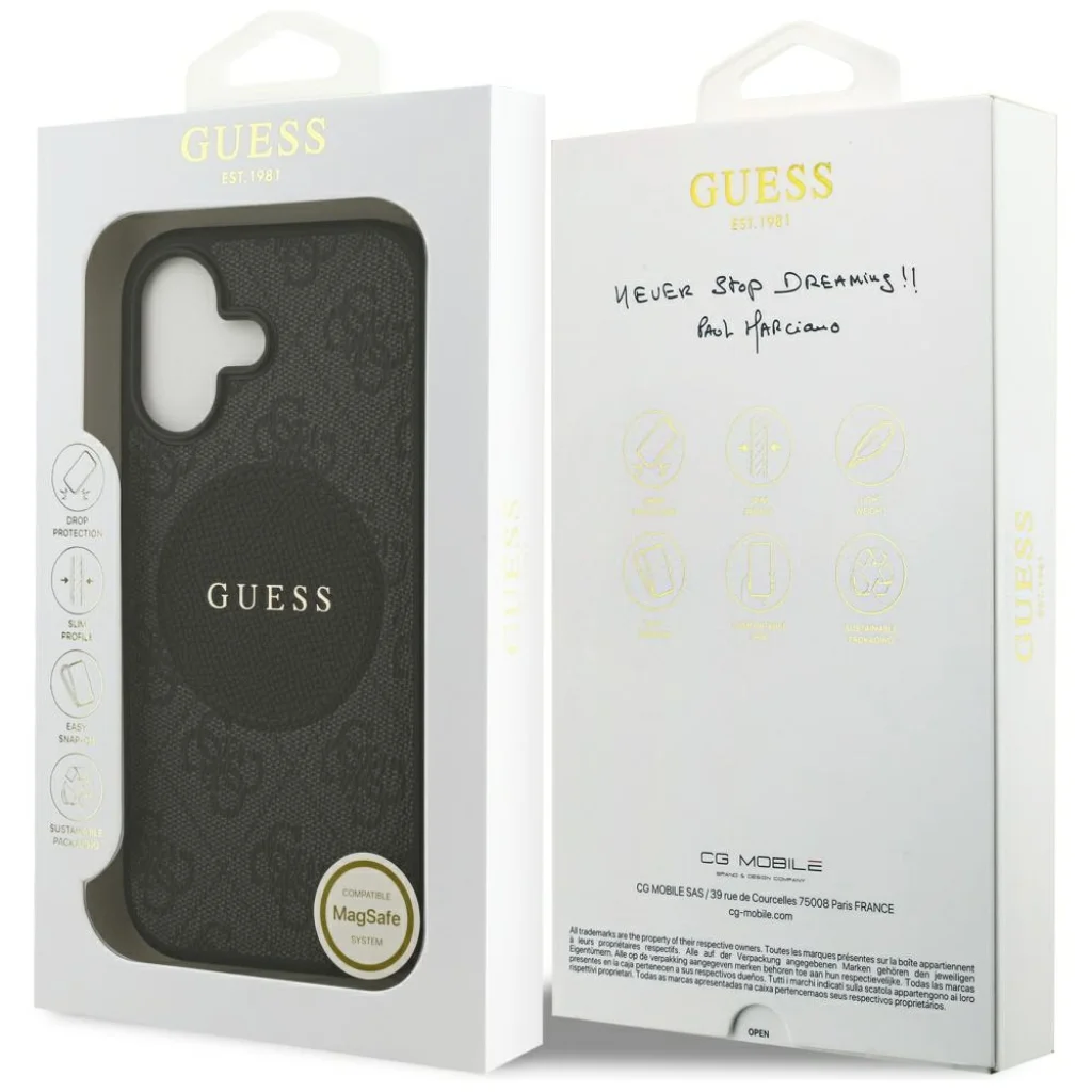Az ekszkluzív 4G Circle Classic Logo MagSafe vonalvédelemmel ötvözi a kiváló funkcionalitást a stílusos, egyedi megjelenéssel. A világhírű Guess márka elegáns és stílusos védőtokja magas színvonalú eco-bőrrel van borítva, melyen a jellegzetes 4G minta díszeleg. A tok közepén finoman kiemelkedő Guess logó a tok presztízsét hangsúlyozza. Tartós konstrukciójának és pontos illeszkedésének köszönhetően hatékonyan védi a telefont az ütésektől és a kijelzőt a sérülésektől, miközben a tok teljes hozzáférést biztosít a portokhoz és gombokhoz. A MagSafe kompatibilis mágnesgyűrű lehetővé teszi a vezeték nélküli töltést, biztosítva ezzel a kényelmes és gyors energiával való ellátást.