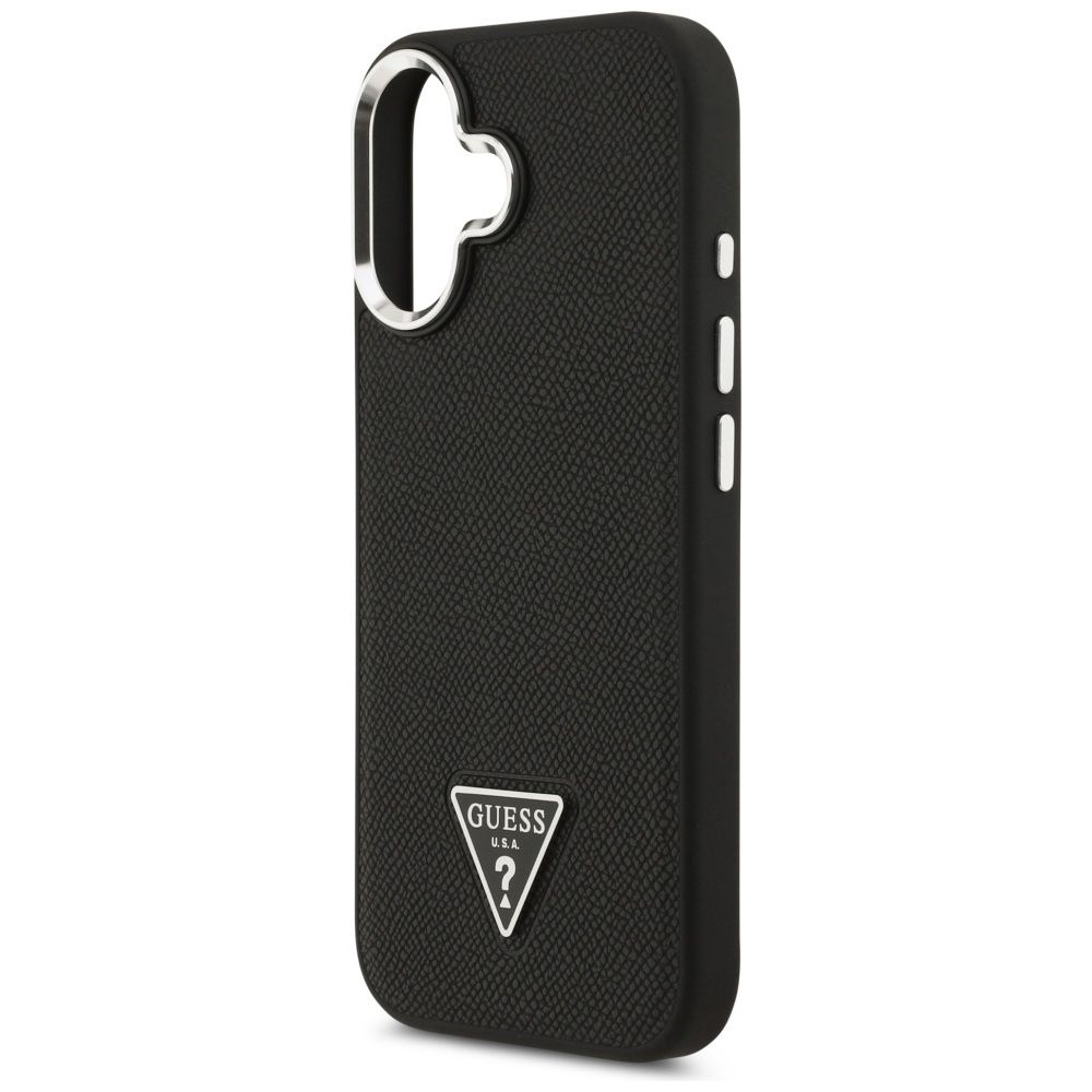 A tok hátlapján található jellegzetes, finoman erezett (grained) textúra luxus érzetet kelt, miközben kiváló fogást biztosít, minimalizálva a kicsúszás esélyét. Az alsó részén elhelyezkedő, ezüst színű, fém Guess logó – a márkára jellemző háromszög alakzatban, a "GUESS U.S.A." felirattal és ikonikus kérdőjellel – azonnal felismerhetővé teszi a prémium minőséget és a divatos megjelenést. A kamera modul körüli ezüst keret és a szintén ezüst színű, precízen illeszkedő gombok tovább fokozzák a tok exkluzív esztétikáját, harmonikus egységet alkotva a logóval. A tok vékony profilja (Slim Profile) nem növeli feleslegesen az iPhone 17 méretét, megőrizve annak eredeti, karcsú vonalait.