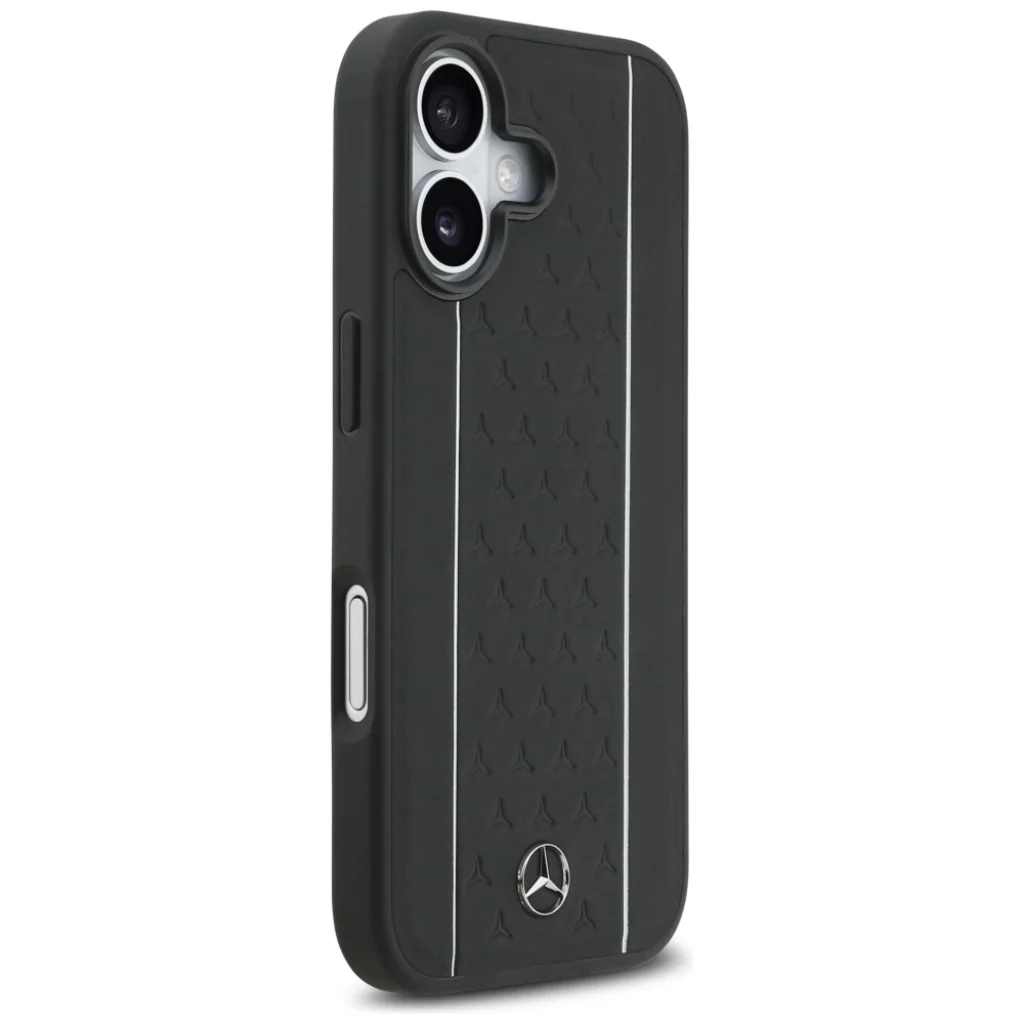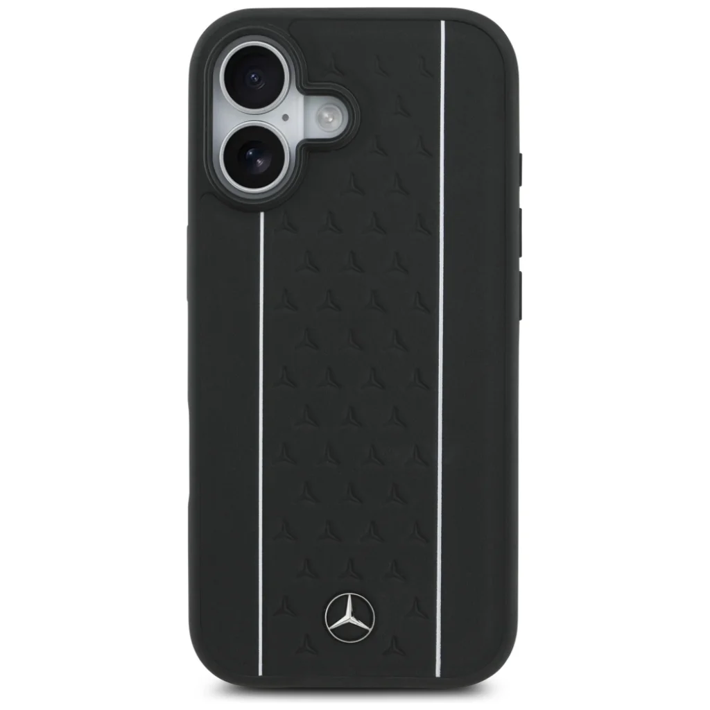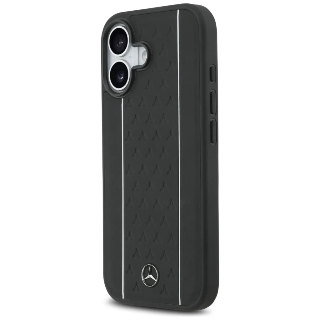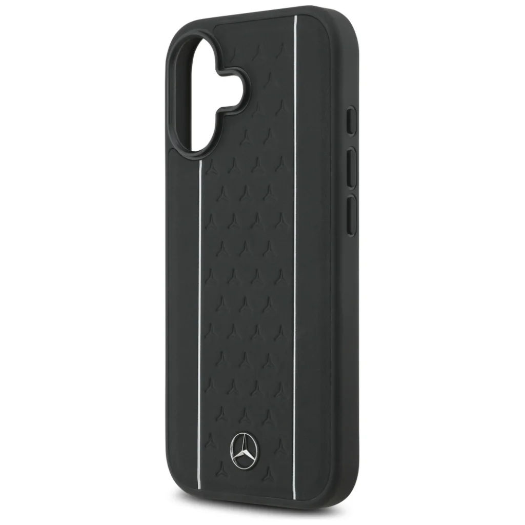 - Ikonikus mercedes-benz design: A tok hátoldalát elegáns fekete szín, letisztult, függőleges ezüst csíkok, valamint a csíkok között apró, dombornyomott Mercedes-Benz csillagok díszítik, melyek egyedi, bőrhatású textúrát kölcsönöznek a felületnek. A tok alján elhelyezett fém Mercedes-Benz logó tökéletesen kiegészíti az exkluzív megjelenést.