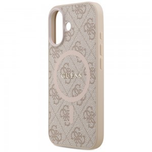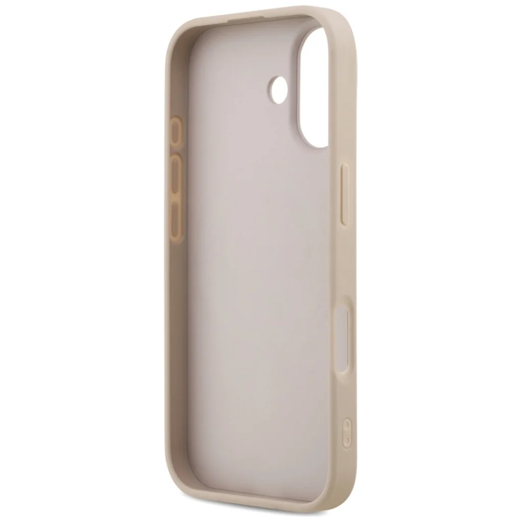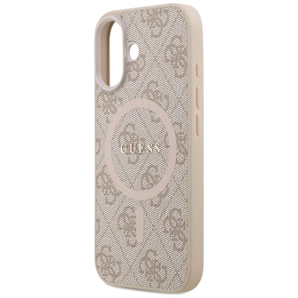 A tok hátlapját a Guess ikonikus, dombornyomott 4G logó mintázata díszíti, amely azonnal felismerhetővé teszi a prémium márkát. A finom bézs színárnyalatot elegáns, fényes arany Guess logó egészíti ki, amely a MagSafe gyűrű közepén helyezkedik el, vizuálisan is kiemelve a funkciót.