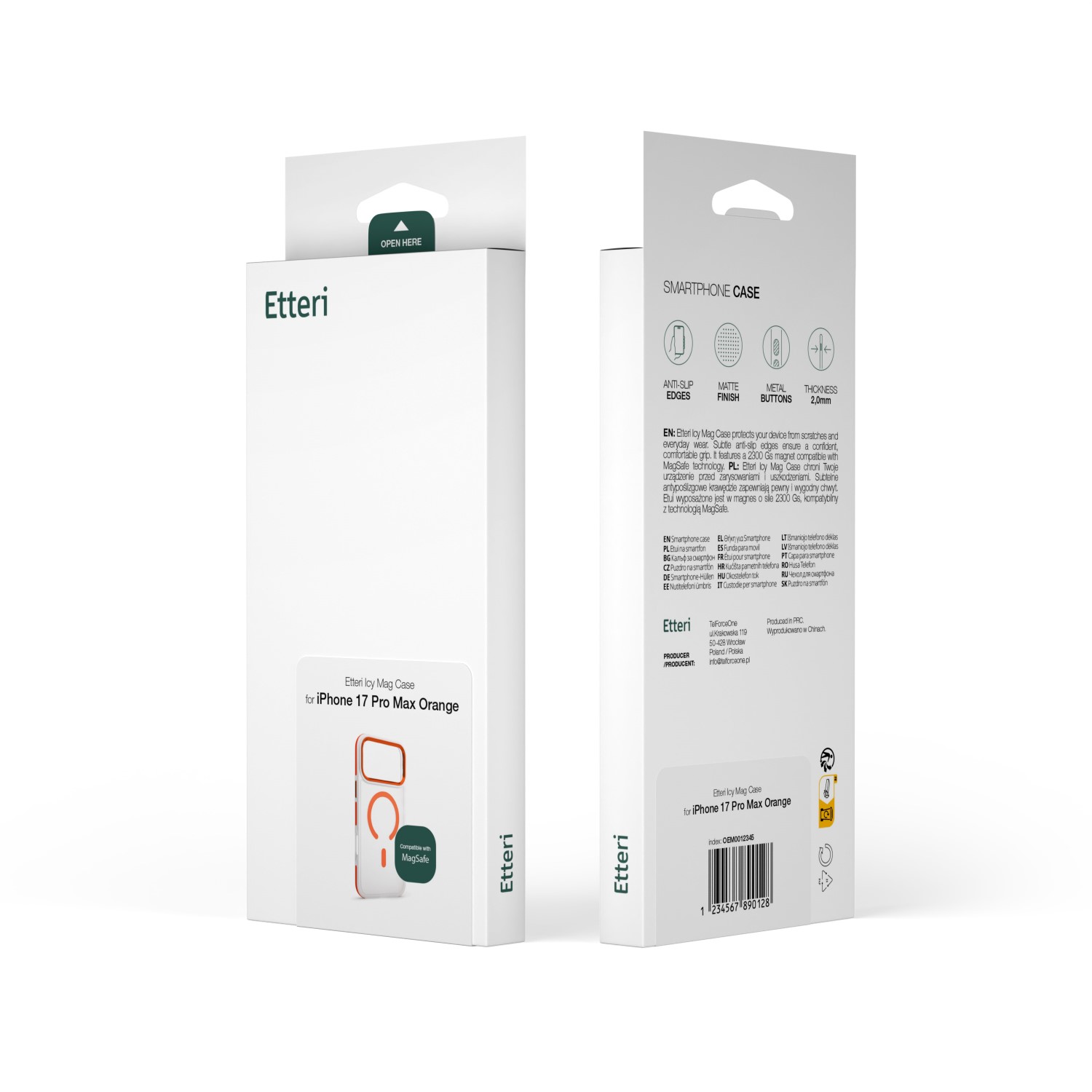 Az Etteri Icy Mag tok hátoldala matt felületű, amely hatékonyan csökkenti az ujjlenyomatok megjelenését. A finom textúrával ellátott felület javítja a tapadást, így a készülék biztonságosan illeszkedik a kézbe. A szélek különleges csúszásmentes bevonattal rendelkeznek, ami csökkenti a telefon véletlen leejtésének esélyét a mindennapi használat során. A fémes és színes díszítések eleganciát és egyedi karaktert kölcsönöznek a toknak.