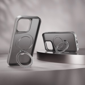 Kétféle anyagból készült: puha TPU és kemény PC. A 2,5 mm vastagság az ideális kompromisszum a vékony és a védelem biztosítása között. A megemelt szélek további védelmet nyújtanak a képernyőnek a sérülés ellen. Egy diszkrét, dombornyomott logó található a tok oldalán, amely stílusos és minimalista jelleget kölcsönöz a teljes tervezésnek. A 2700 GS erősségű beépített mágnesekkel ellátott fém tartó kényelmes állványként szolgál filmek nézéséhez vagy videohívások lebonyolításához, és biztonságosabb fogást is biztosít a telefon használatakor. A fogaskerék mechanizmus egy diszkrét, kellemes hangot ad minden mozdulathoz.
