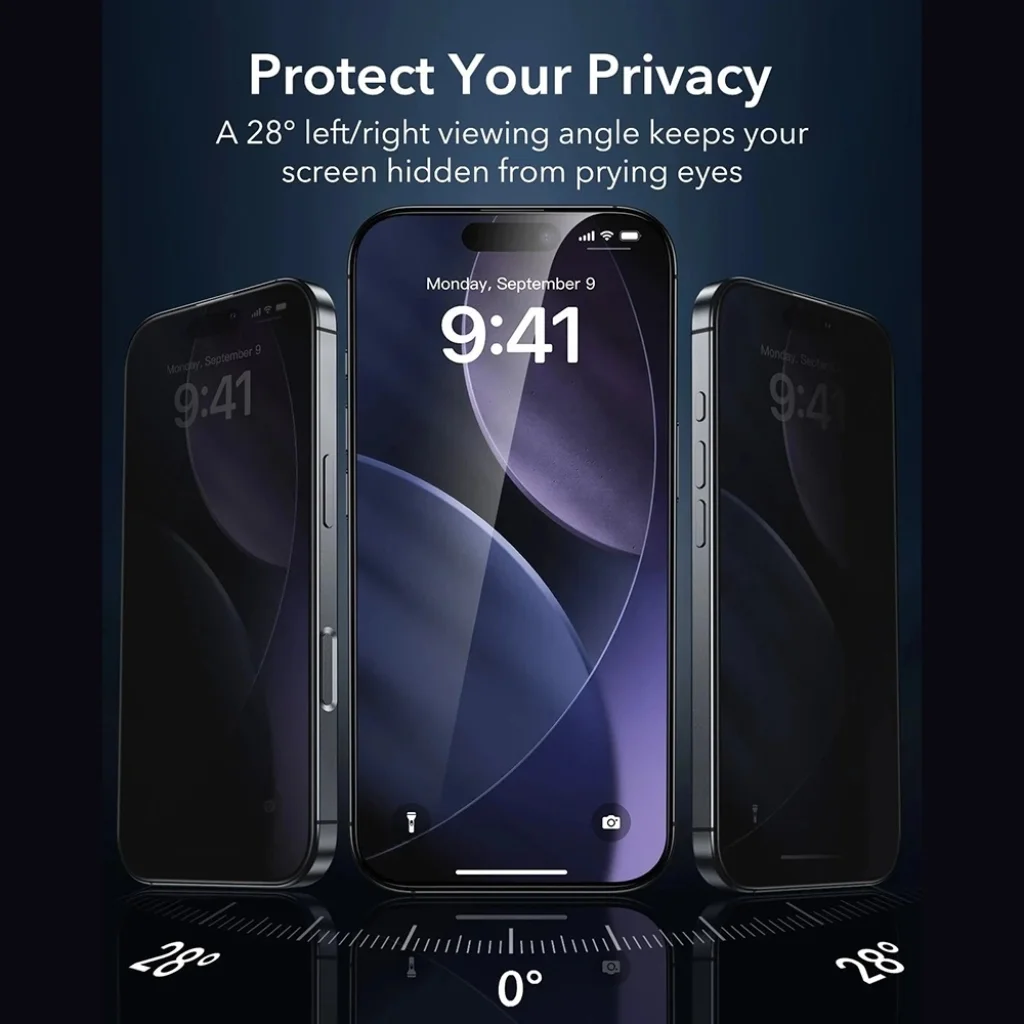 A képernyővédő speciális privát szűrővel rendelkezik, amely biztosítja, hogy a kijelző tartalma csak a közvetlenül elől néző felhasználó számára legyen látható. Már 28 fokos szögtől jobbra és balra (összesen 56 fokos szögben) a képernyő elsötétedik, megakadályozva, hogy a körülöttünk lévők betekintsenek személyes üzeneteinkbe, banki adatainkba vagy bármilyen bizalmas tartalomba.