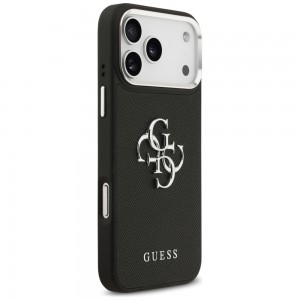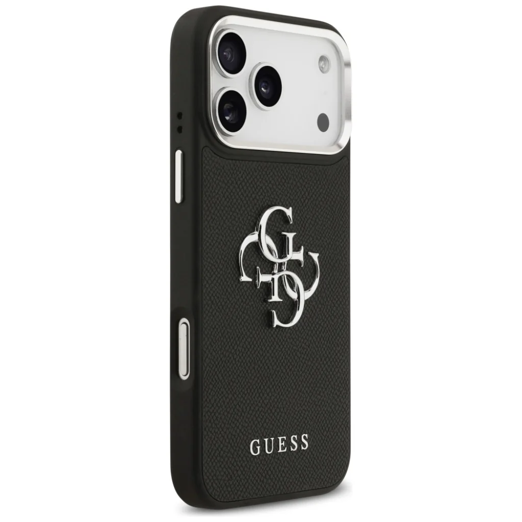 A tok elegáns fekete színben pompázik, amelyet a jellegzetes 4G mintázatú, texturált felület (grained) tesz különlegessé, prémium, Saffiano bőrre emlékeztető tapintással. A hátoldalon nagyméretű, fényes ezüst Guess monogram logó (GG) dominál, alatta pedig a „GUESS” felirat diszkréten hirdeti a márka nevét. Az ezüst színű kamera kivágás körüli keret és az oldalsó gombok elegáns kontrasztot képeznek a fekete tokkal, kiemelve a telefon prémium megjelenését. Ez a klasszikus, mégis modern design azonnal felismerhetővé teszi készülékét.