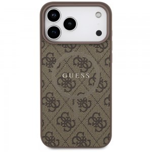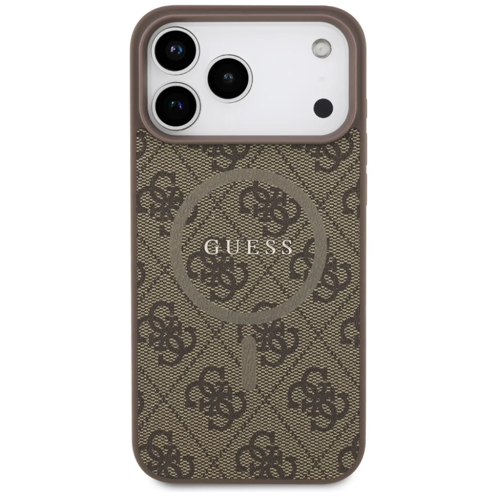 A tokot a Guess jellegzetes, időtlen 4G monogram mintája díszíti, amely azonnal felismerhetővé teszi a márkát. A mély, gazdag barna szín kiválóan illeszkedik minden öltözékhez és alkalomhoz, luxus és professzionális megjelenést kölcsönözve iPhone 17 Pro telefonodnak. A tok hátulján található, kör alakú MagSafe gyűrű diszkréten emeli ki a GUESS logót, tökéletes összhangot teremtve a funkcionalitás és az esztétika között.