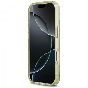 A tok kiemelkedő jellemzője a "Metal Glitter Flowers Triangle" design. Az In-Mould Labeling (IML) technológiának köszönhetően a tok felületébe integrált, részletgazdag virágmintázat (magnólia virágok és levelek, rejtett méhek/rovarok) sosem kopik le, és tapintható mélységet ad a felületnek. A halványzöld alapszín finom ragyogást kap a beleépített csillámoknak köszönhetően, ami elegáns és csillogó megjelenést kölcsönöz. A tok hátlapján elhelyezkedő kör alakú, szintén csillámos felületű MagSafe gyűrűn büszkén díszeleg az ikonikus Guess U.S.A. háromszög logó, mely tökéletesen illeszkedik a készülék MagSafe rendszeréhez. Az áttetsző, enyhén zöldes oldalak és a kamerát körülölelő fényes arany/metál keret további prémium érzetet biztosít.