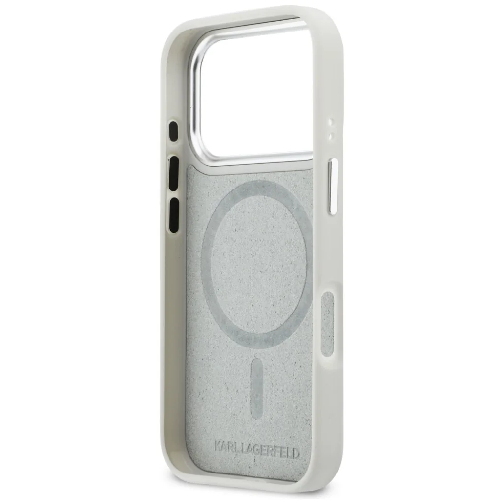 A tokot azonnal felismerhető, részletgazdag krokodilbőr textúra jellemzi a hátlapon, amely páratlanul elegáns megjelenést kölcsönöz készülékének. A dombornyomott, ikonikus "KL" logó diszkréten hirdeti a márka presztízsét, egy csipetnyi luxust csempészve telefonjára. Az ezüstös-fehér színvilág, kiegészülve a kamerakivágás körüli precíz, metálos ezüst kerettel, modern és kifinomult összhatást teremt, tökéletesen illeszkedve az iPhone 17 Pro prémium megjelenéséhez. A gondosan megtervezett slim profil és a könnyű súly biztosítja, hogy a tok ne növelje feleslegesen a telefon méretét vagy súlyát, miközben a puha, mégis tartós anyagok kényelmes fogást biztosítanak.