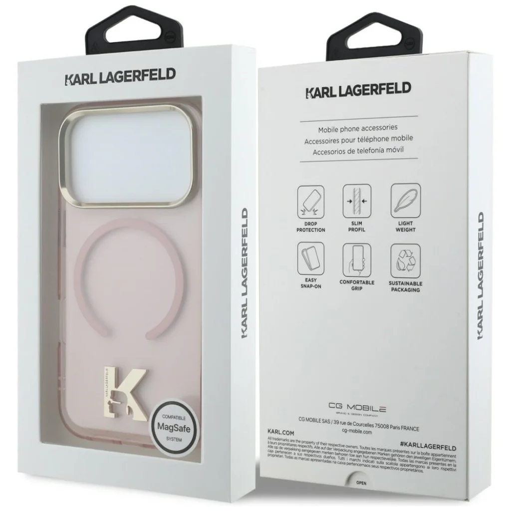 A tok áttetsző, finom rózsaszín árnyalatával diszkrét, mégis kifinomult megjelenést kölcsönöz iPhone 17 Pro telefonodnak. A design csúcspontja a hátlapon található ikonikus, arany színű "K" fej logó, mely alatt a „KARL LAGERFELD” felirat is diszkréten megjelenik. Az IML (In-Mold Labeling) technológiának köszönhetően a grafika be van ágyazva az anyagba, így rendkívül tartós és kopásálló felületet biztosít, amely hosszú távon megőrzi ragyogását. Az arany színű kamera gyűrű és oldalsó gombok elegánsan kiemelik a tok luxus jellegét, harmonizálva az „K” logóval.
