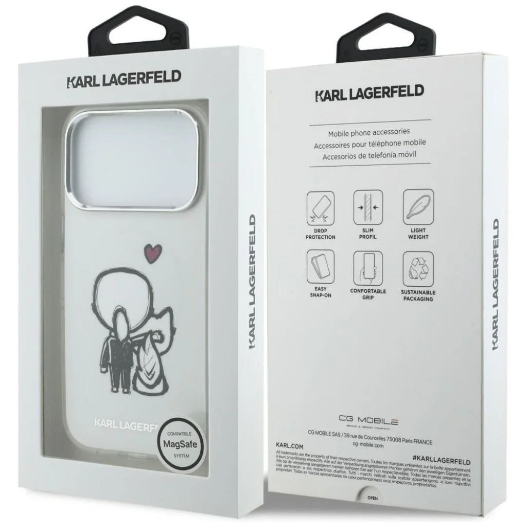 Válaszd az iPhone 17 Pro Karl Lagerfeld Karl & Choupette MagSafe átlátszó hátlapi tokot, ha egyszerre keresed a prémium védelmet, a kifinomult stílust és a modern funkcionalitást!